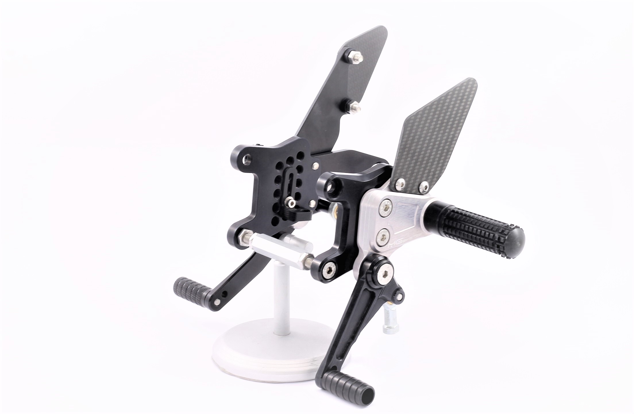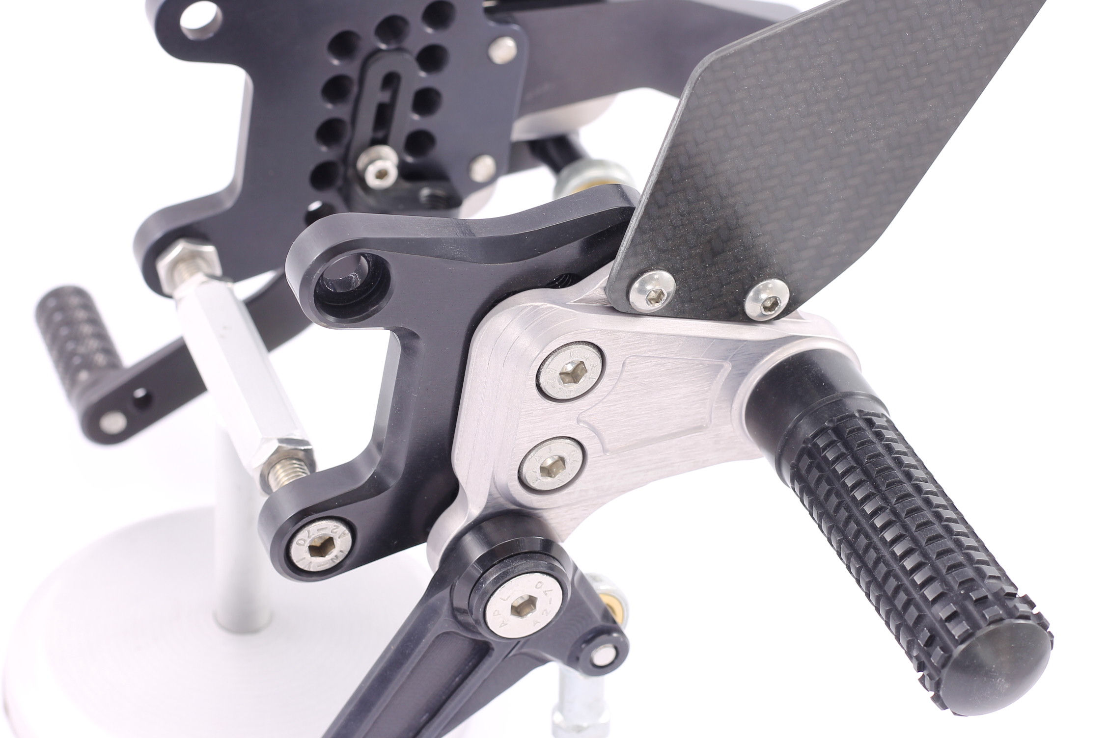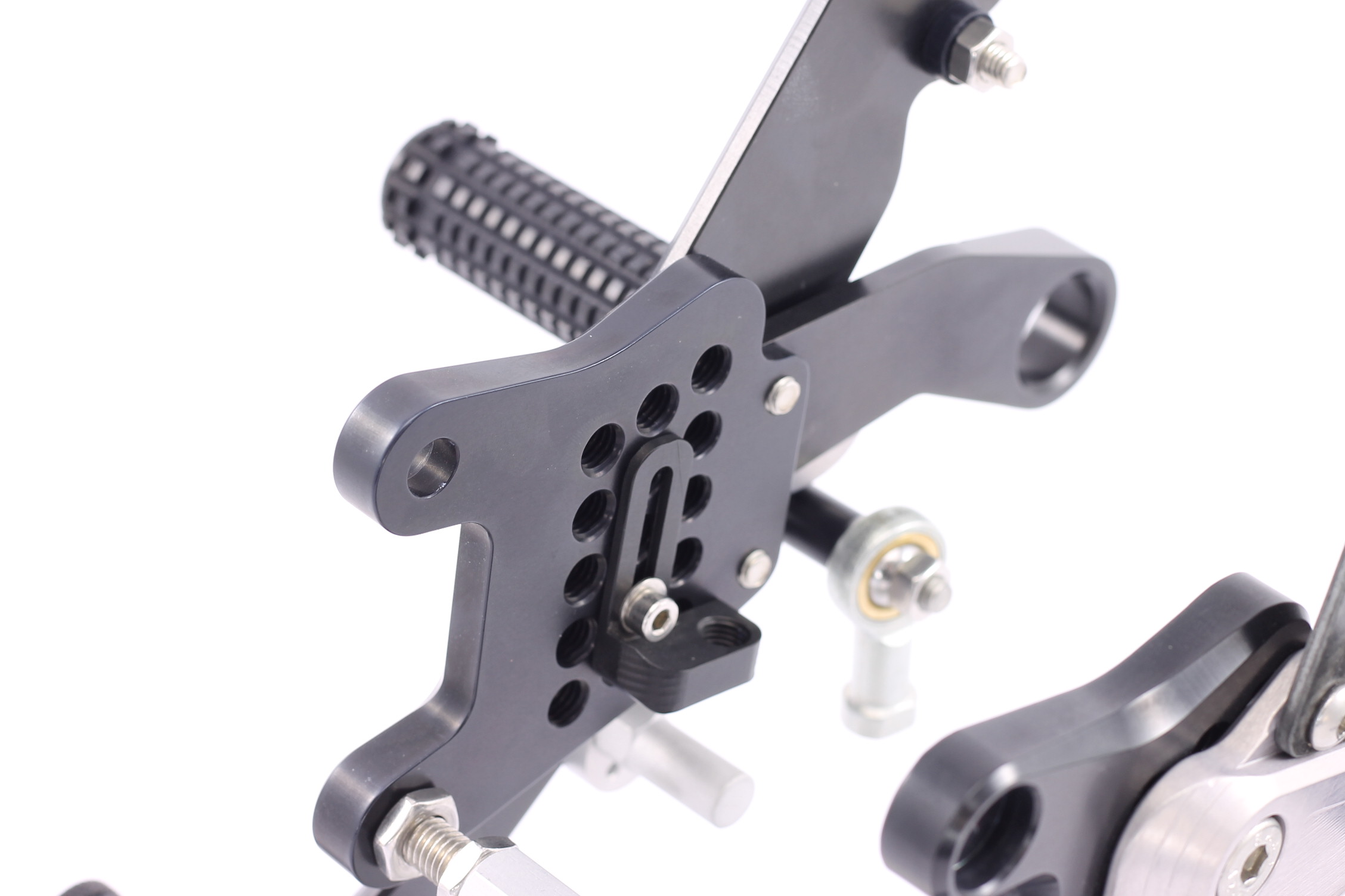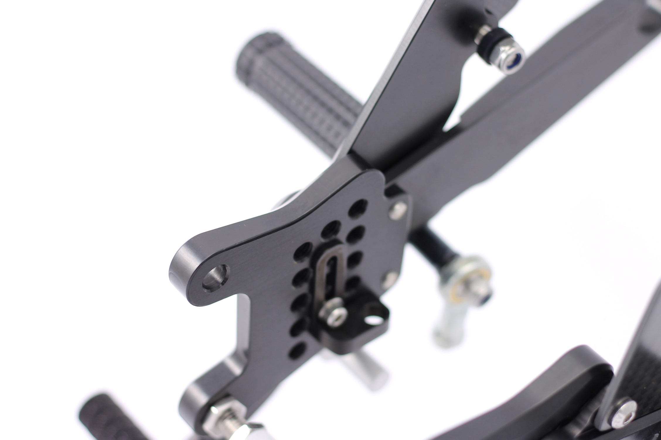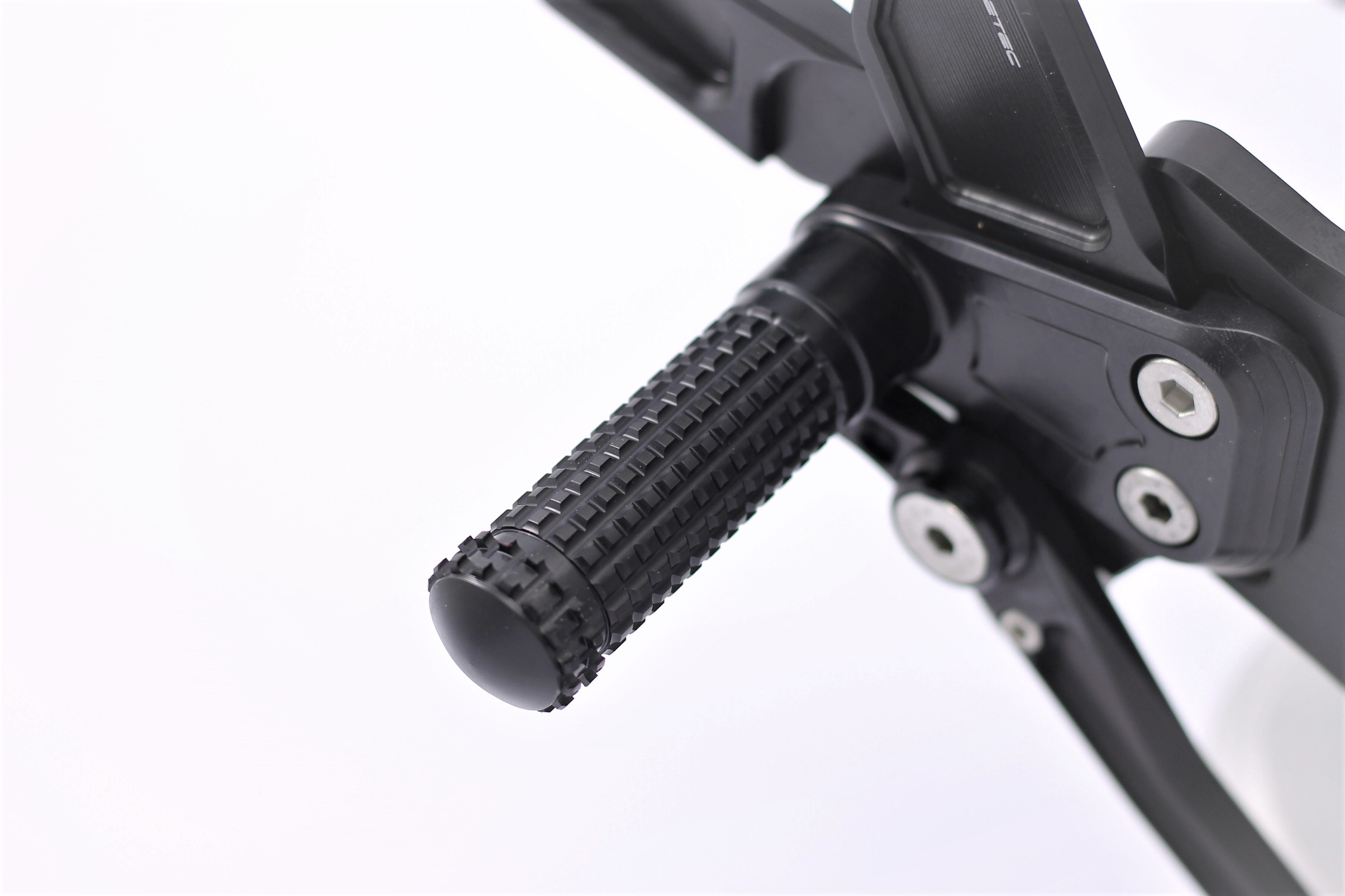 Rennsport erprobte Fussrastenanlage, voll ergonomisch verstellbar in 9 Positionen und bis zu 20 mm
