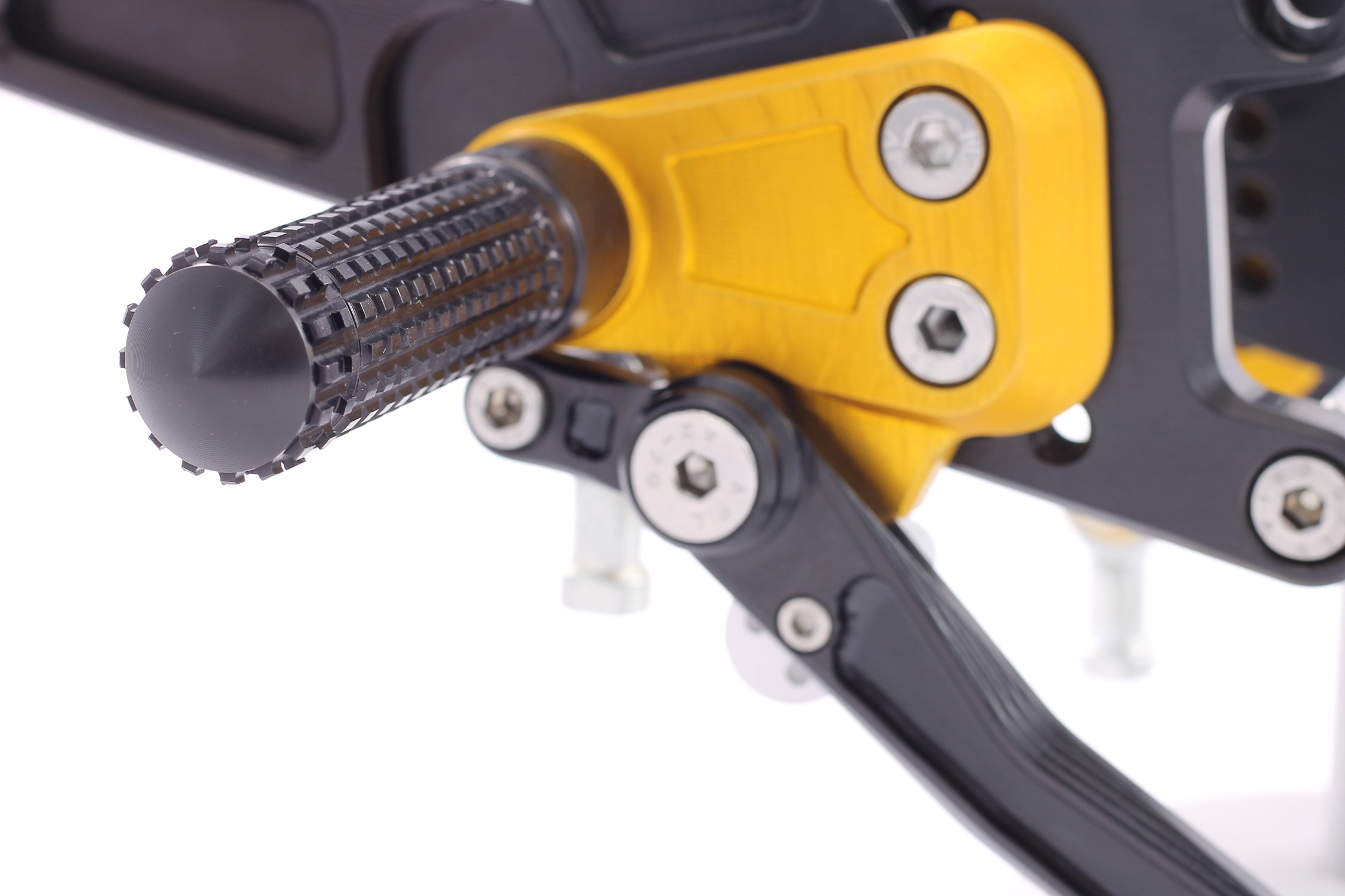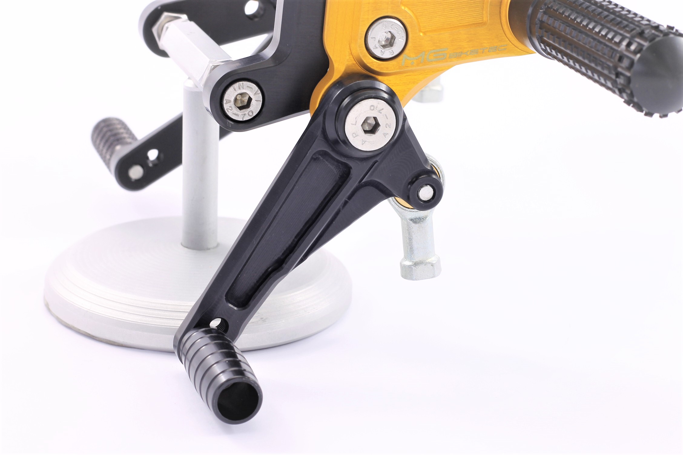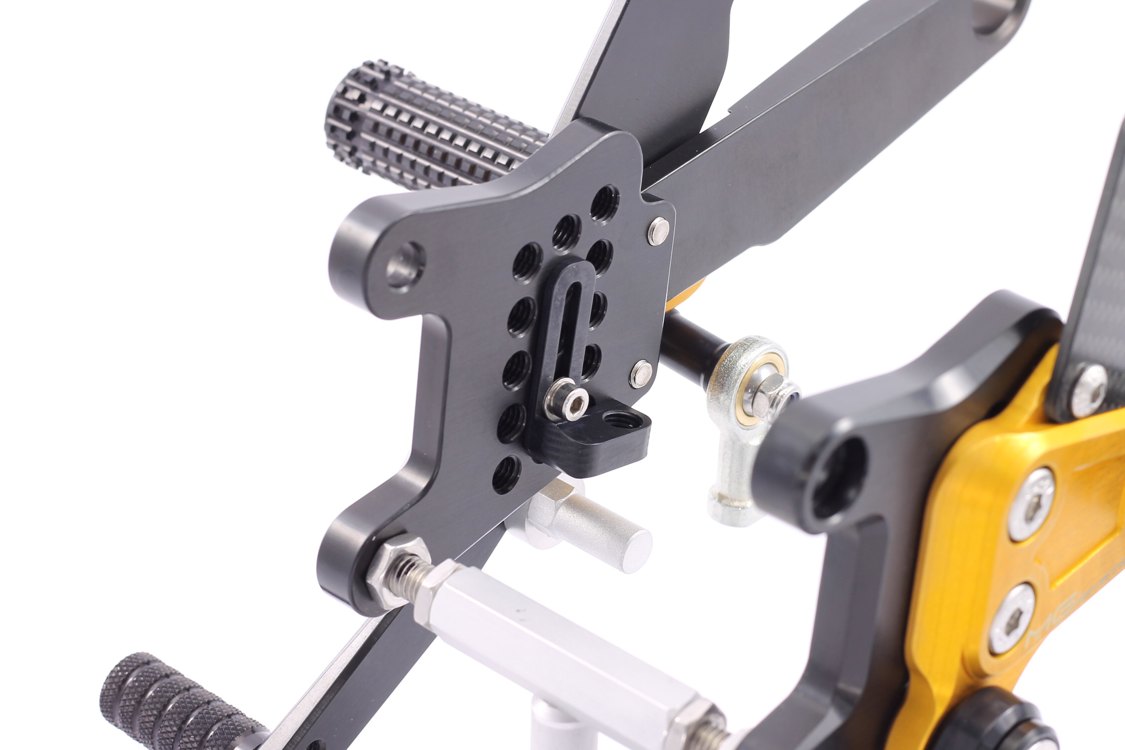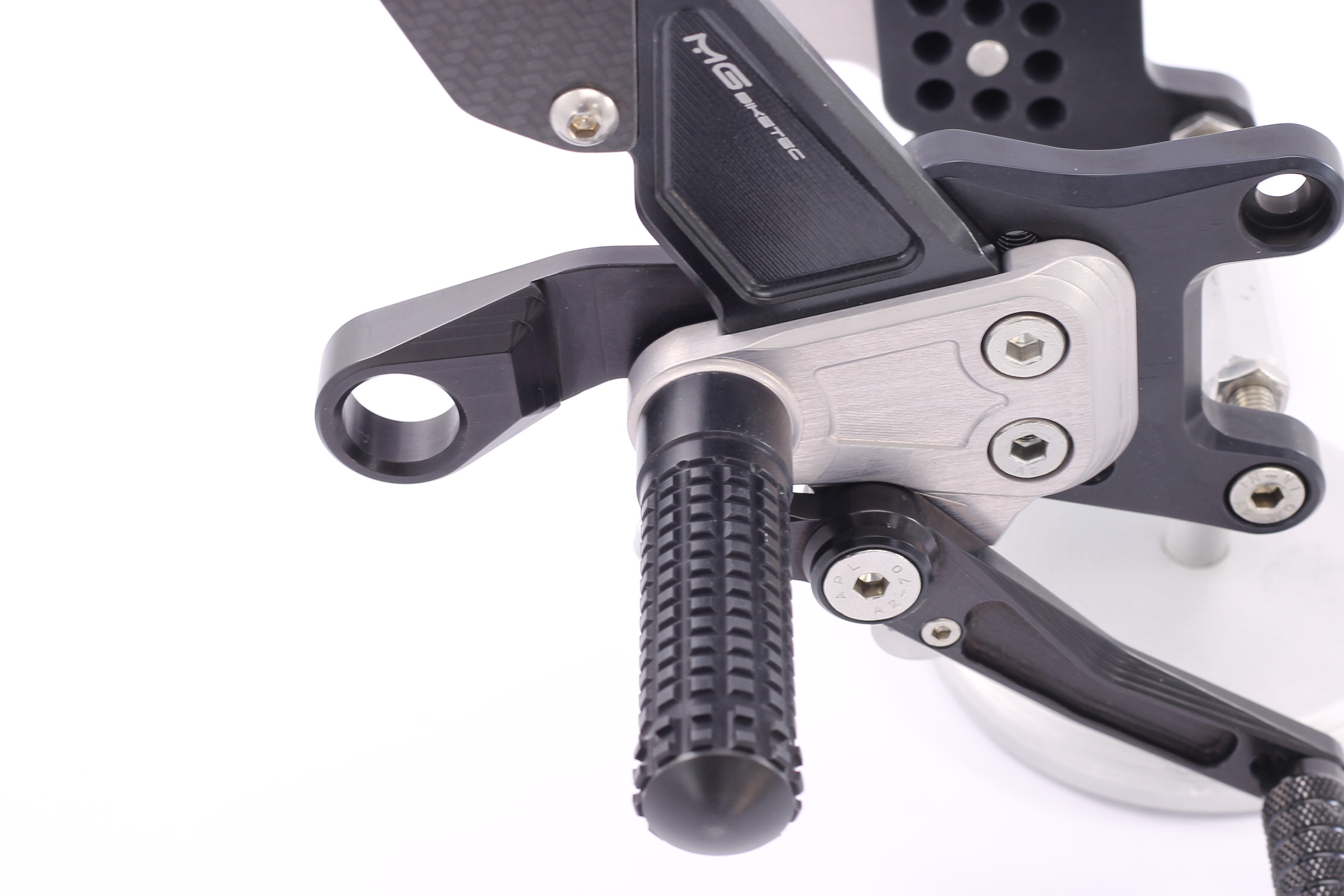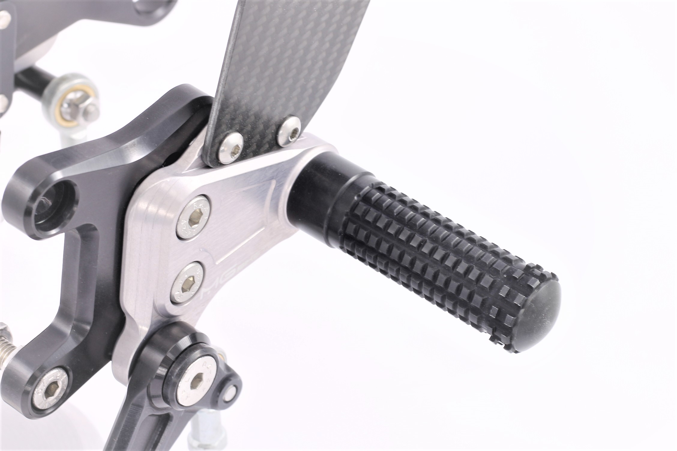Rennsport erprobte Fussrastenanlage, voll ergonomisch verstellbar in 9 Positionen und bis zu 20 mm