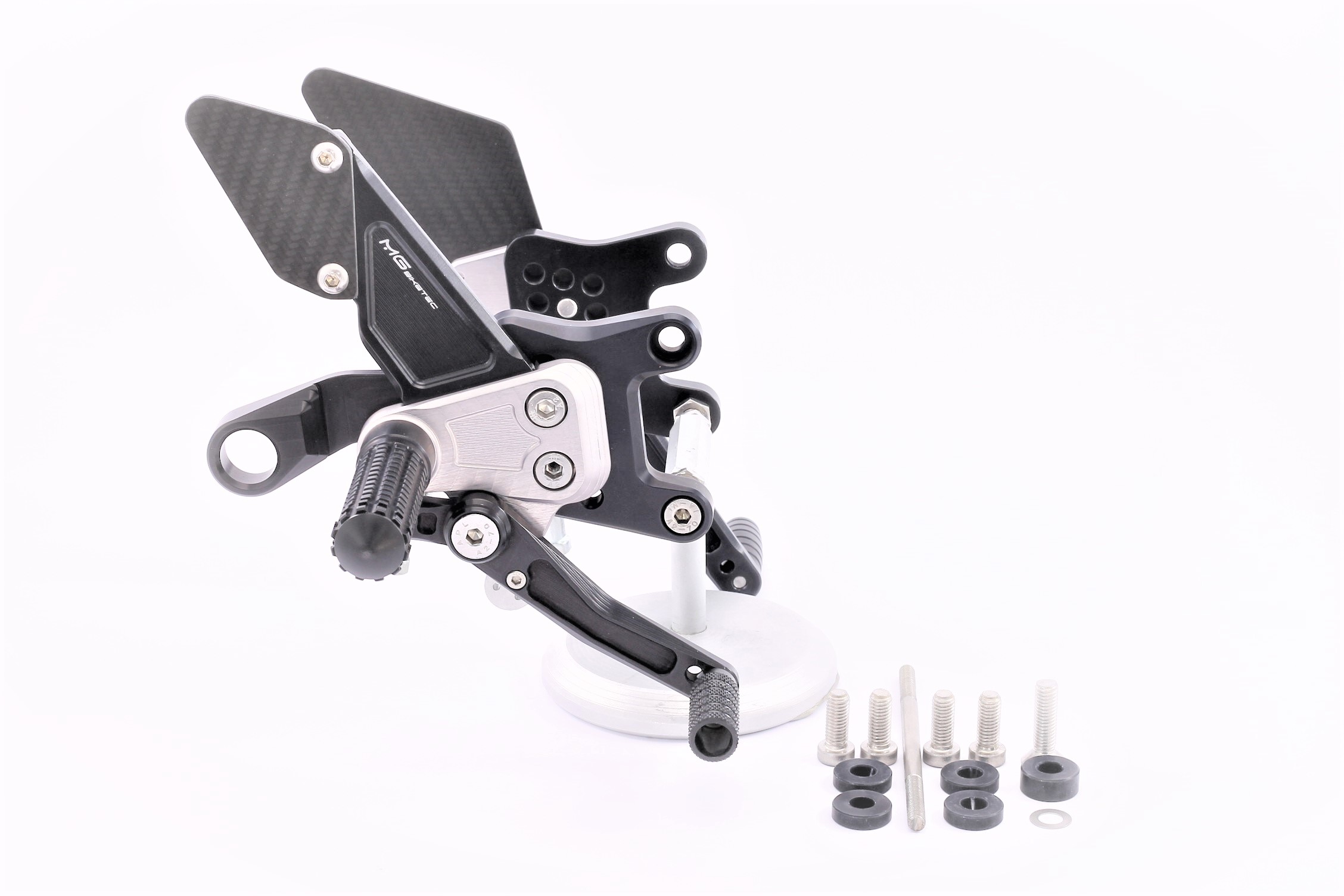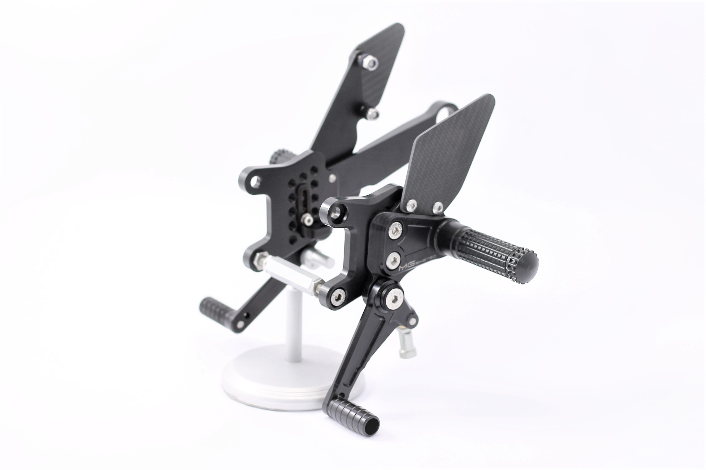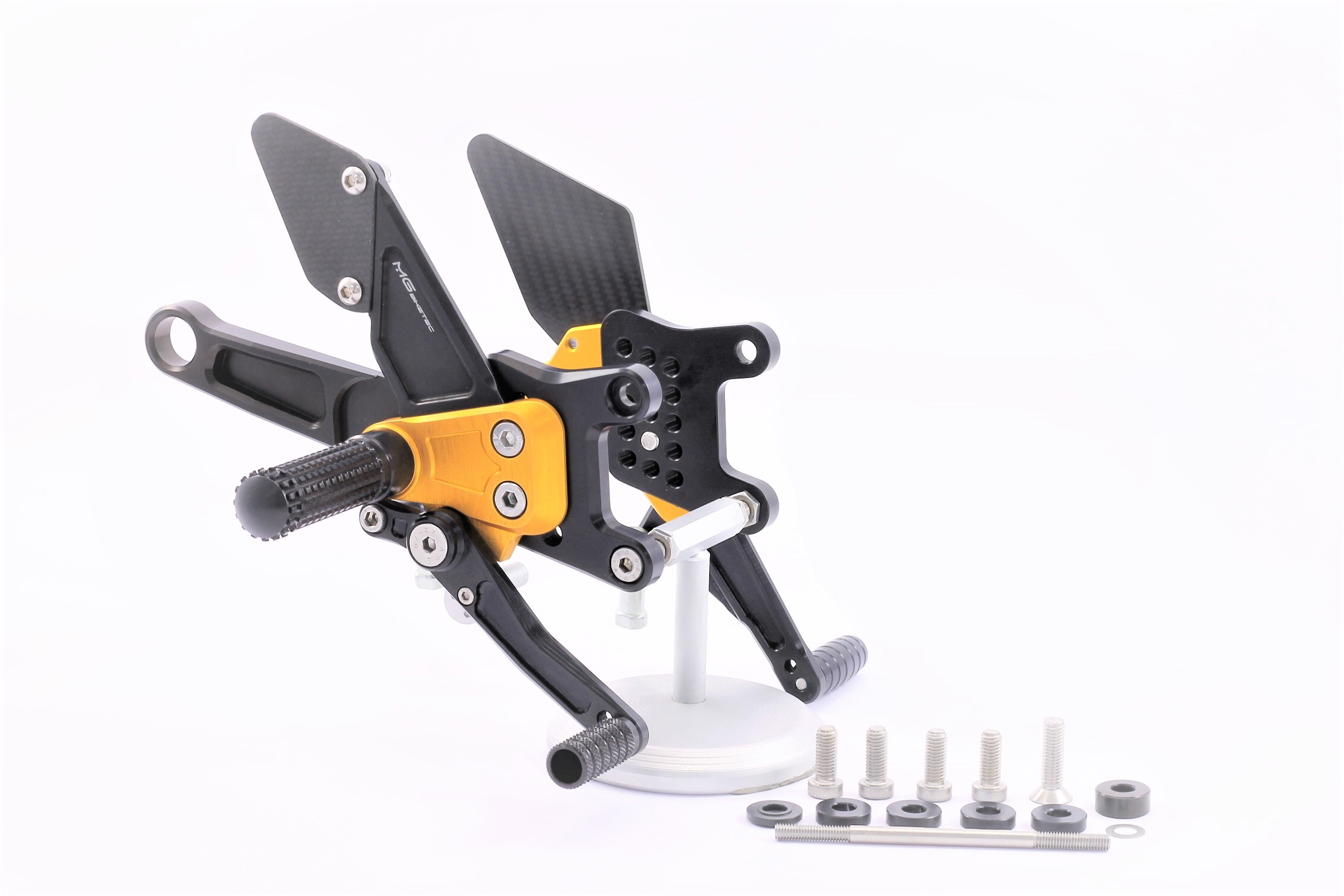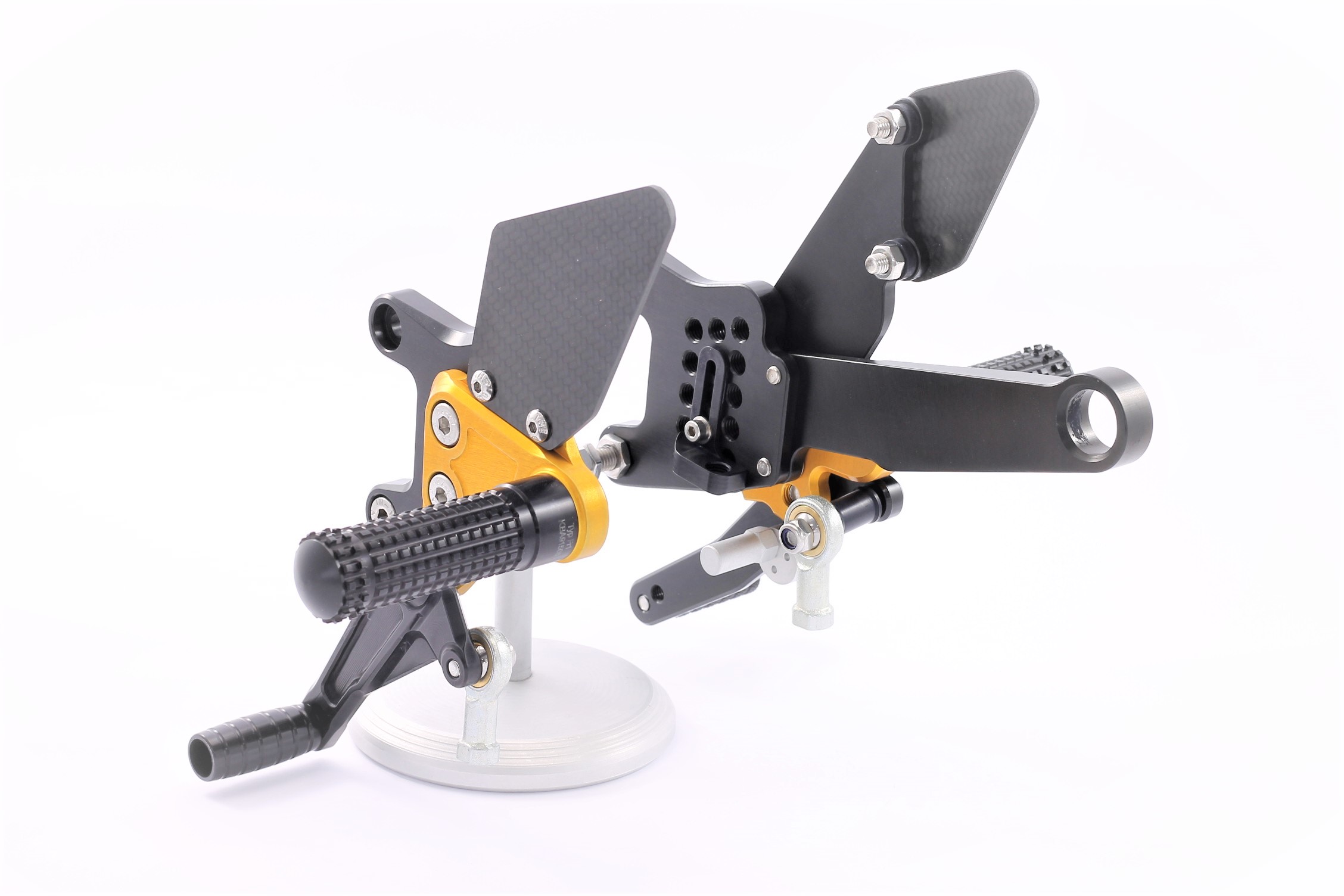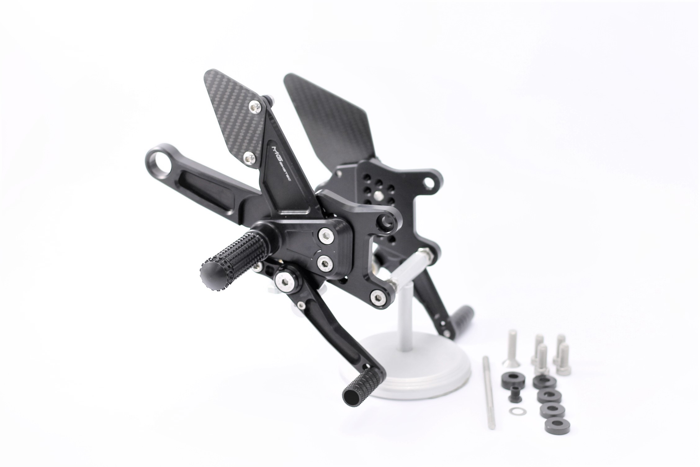 Rennsport erprobte Fussrastenanlage, voll ergonomisch verstellbar in 9 Positionen und bis zu 20 mm