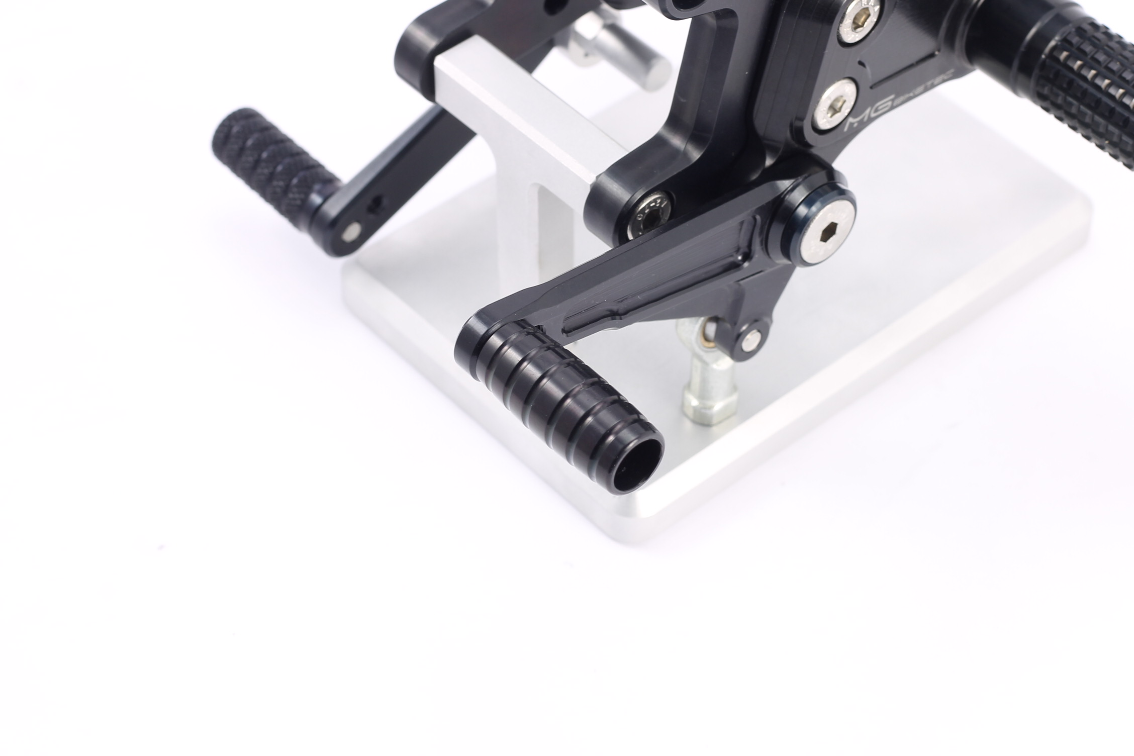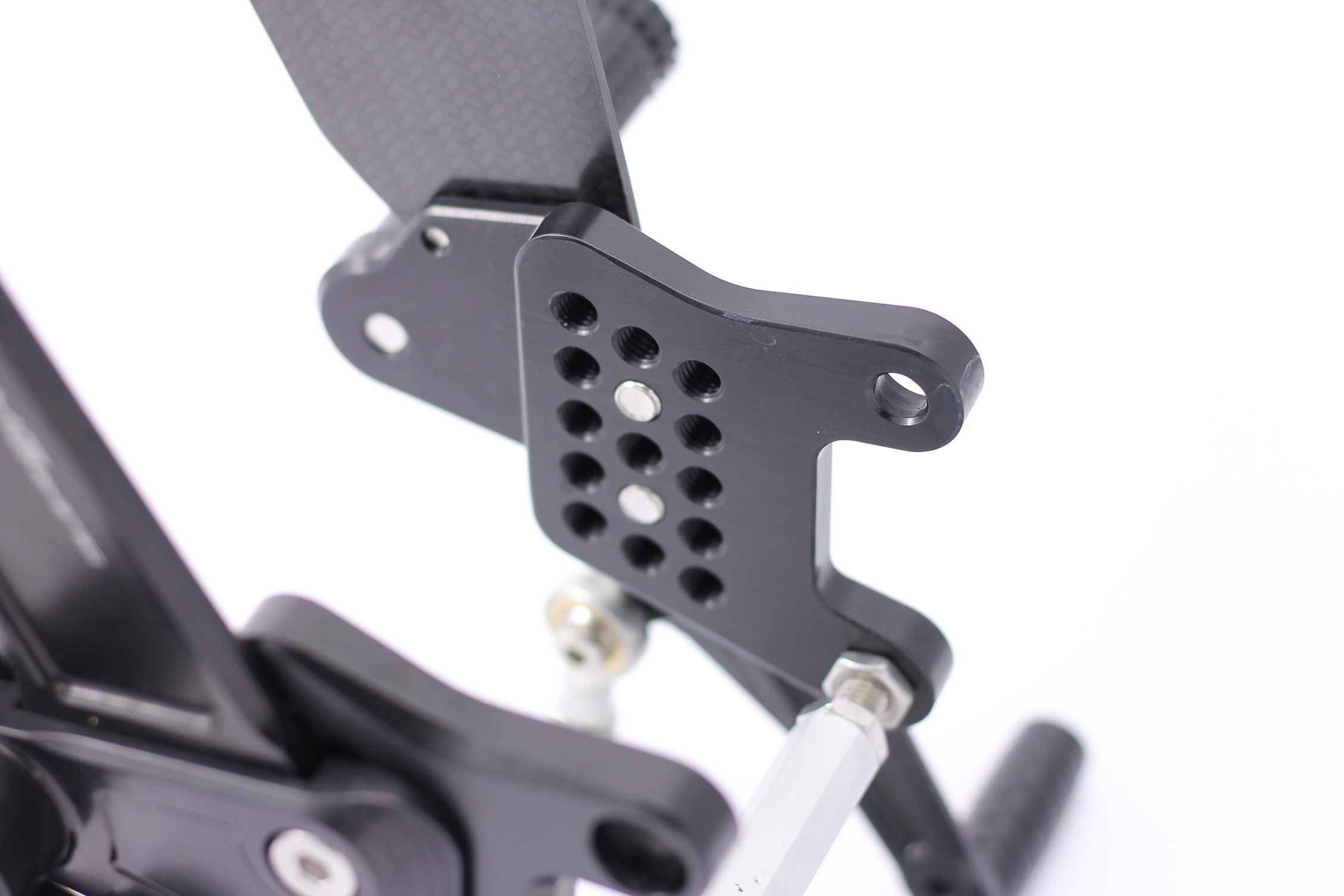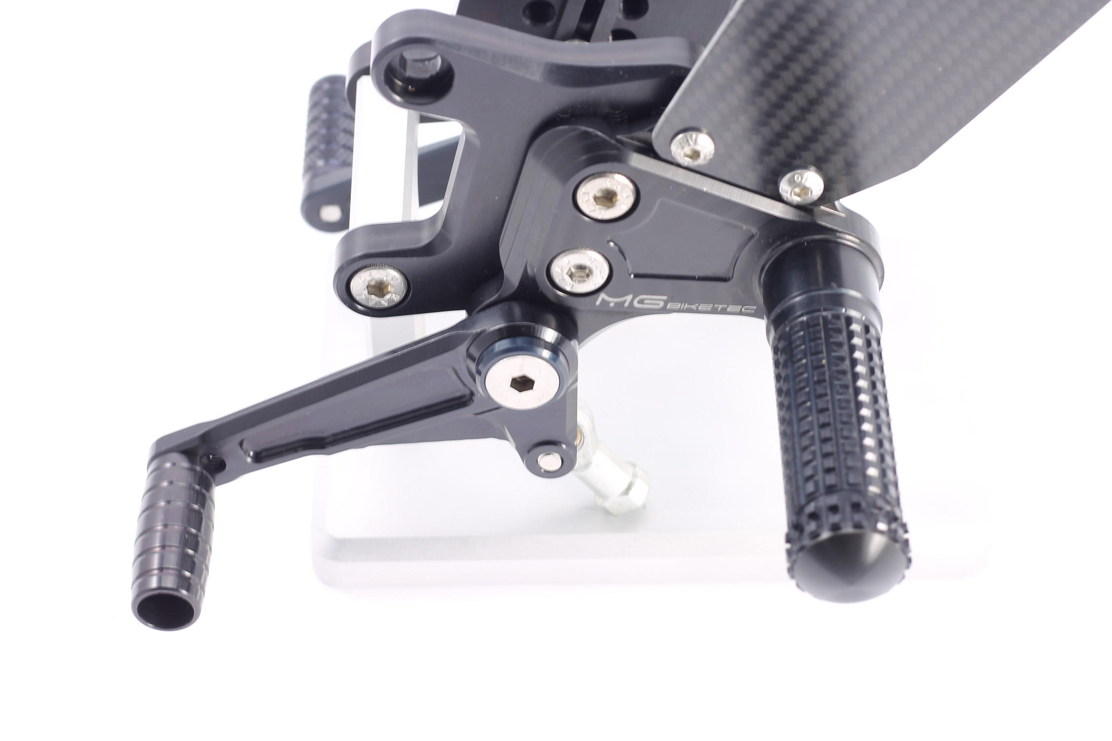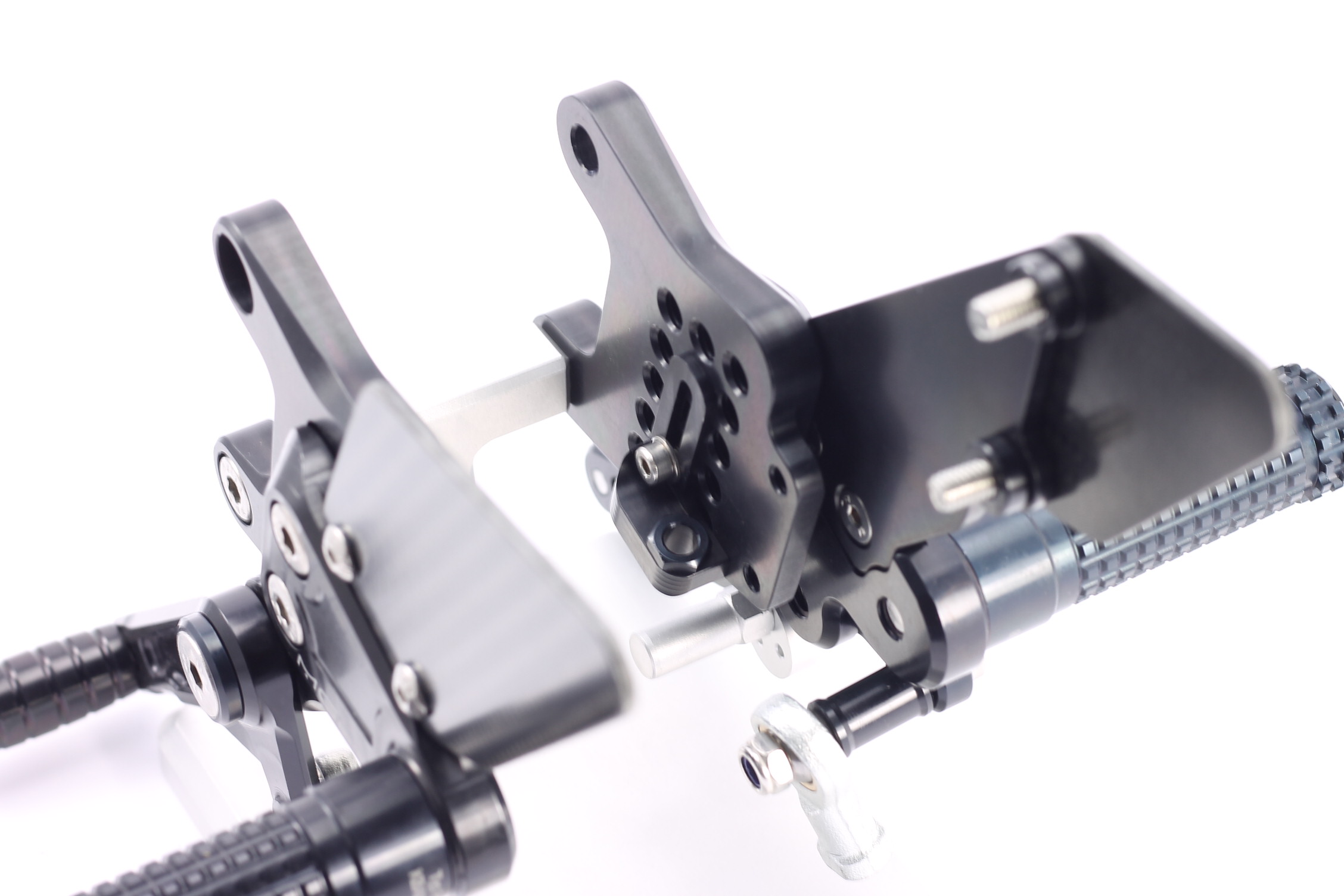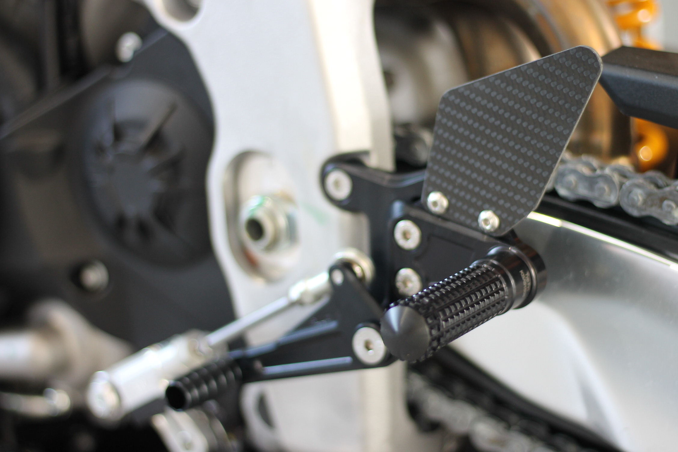 Rennsport erprobte Fussrastenanlage, voll ergonomisch verstellbar in 9 Positionen und bis zu 22 mm