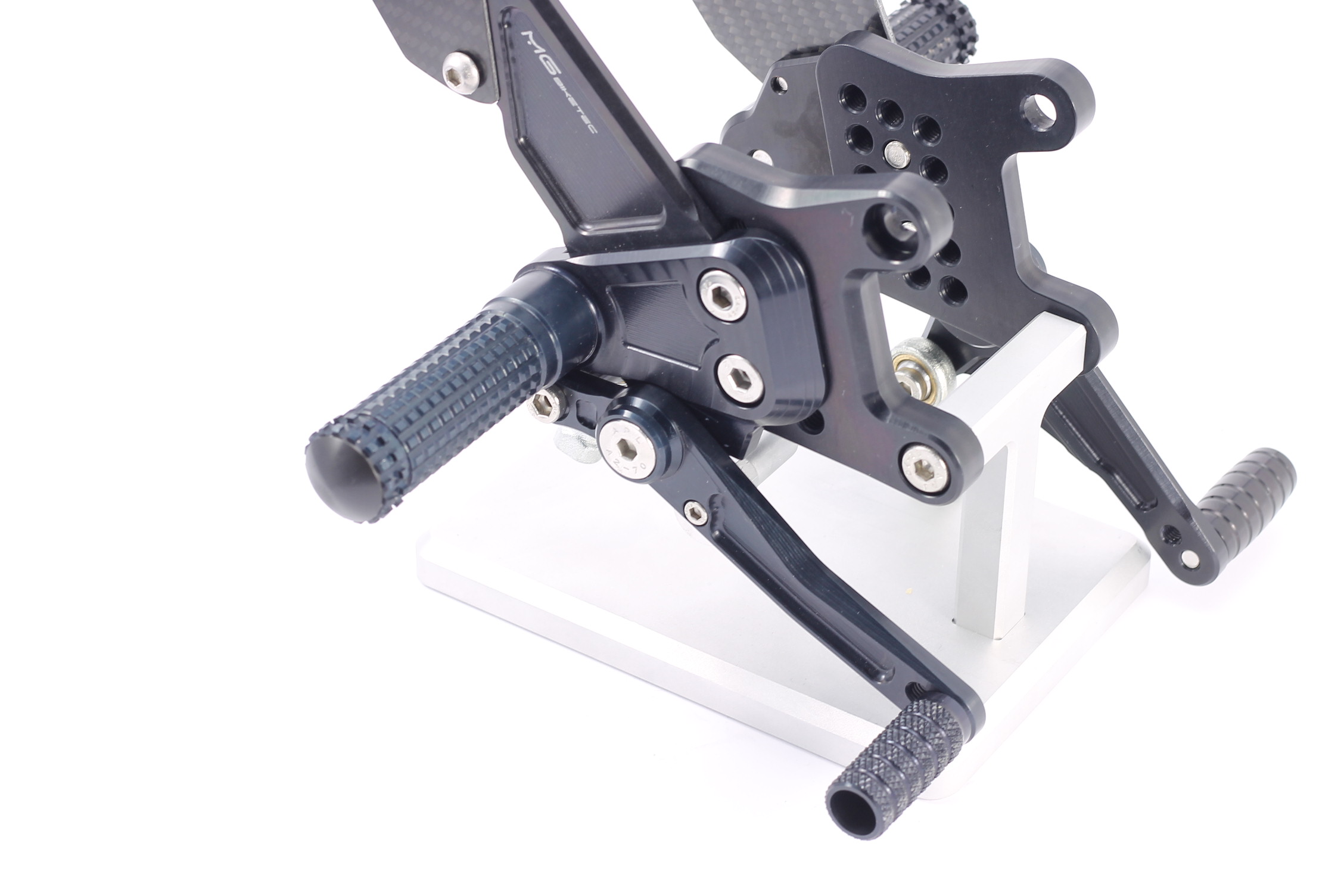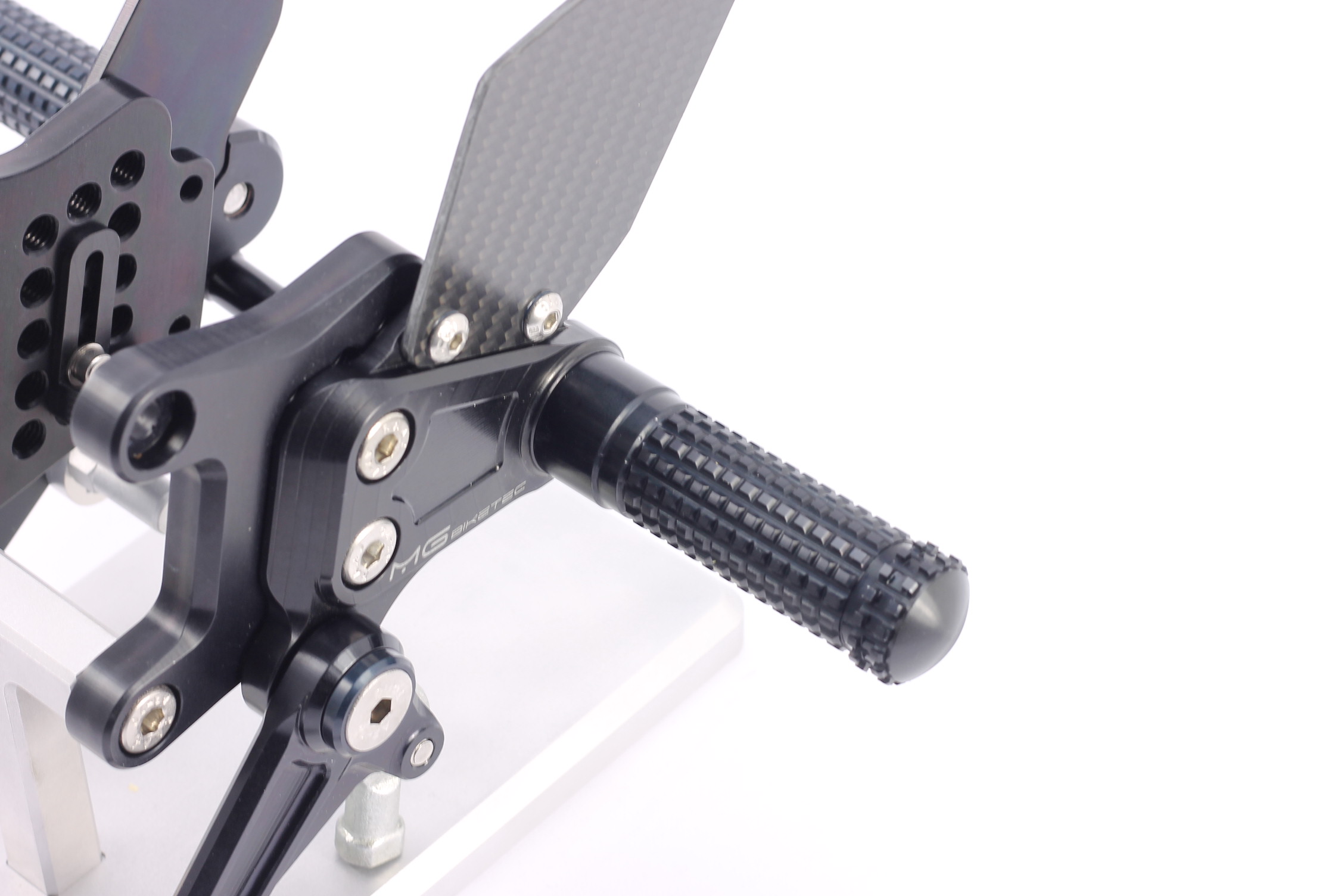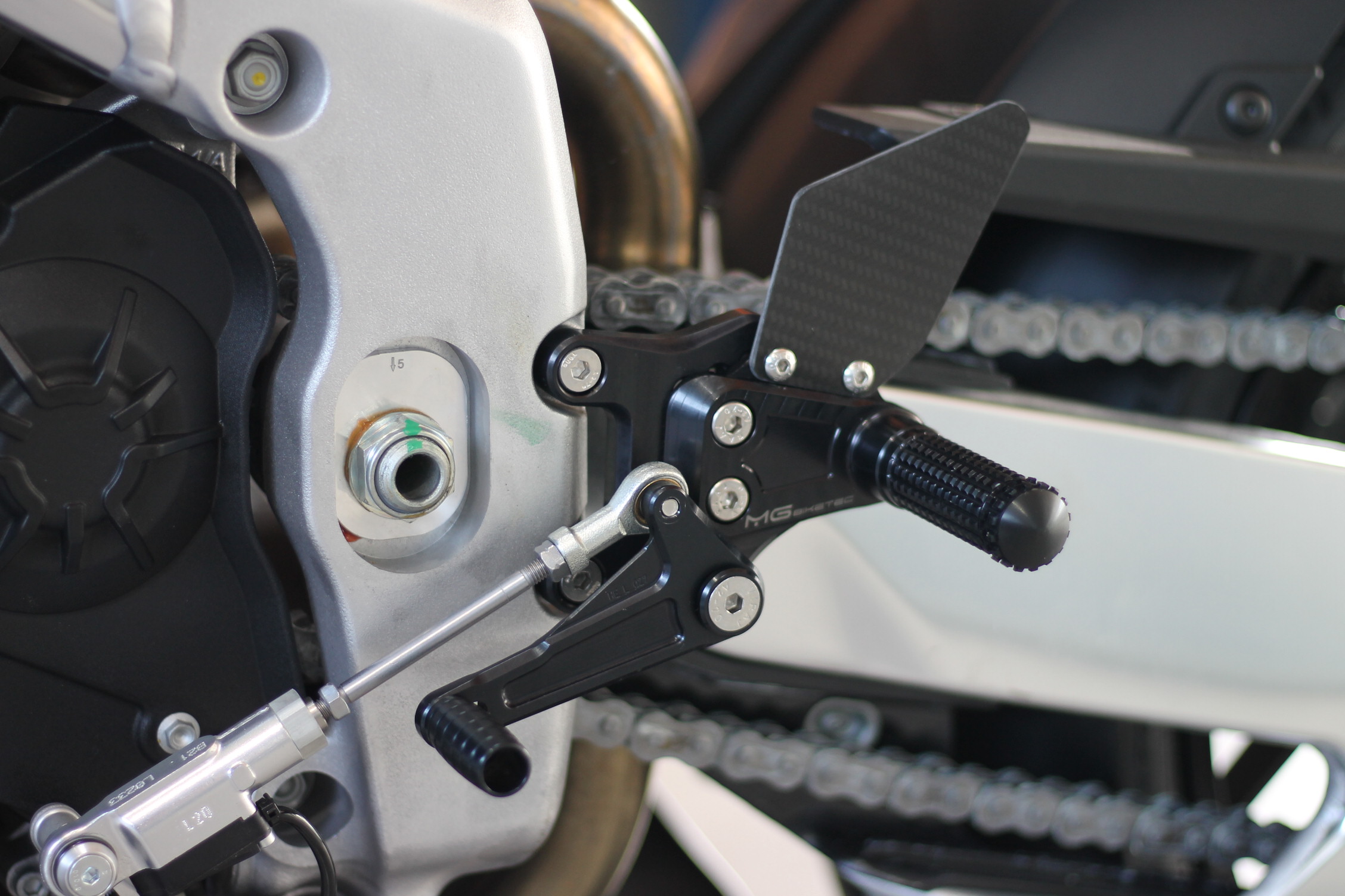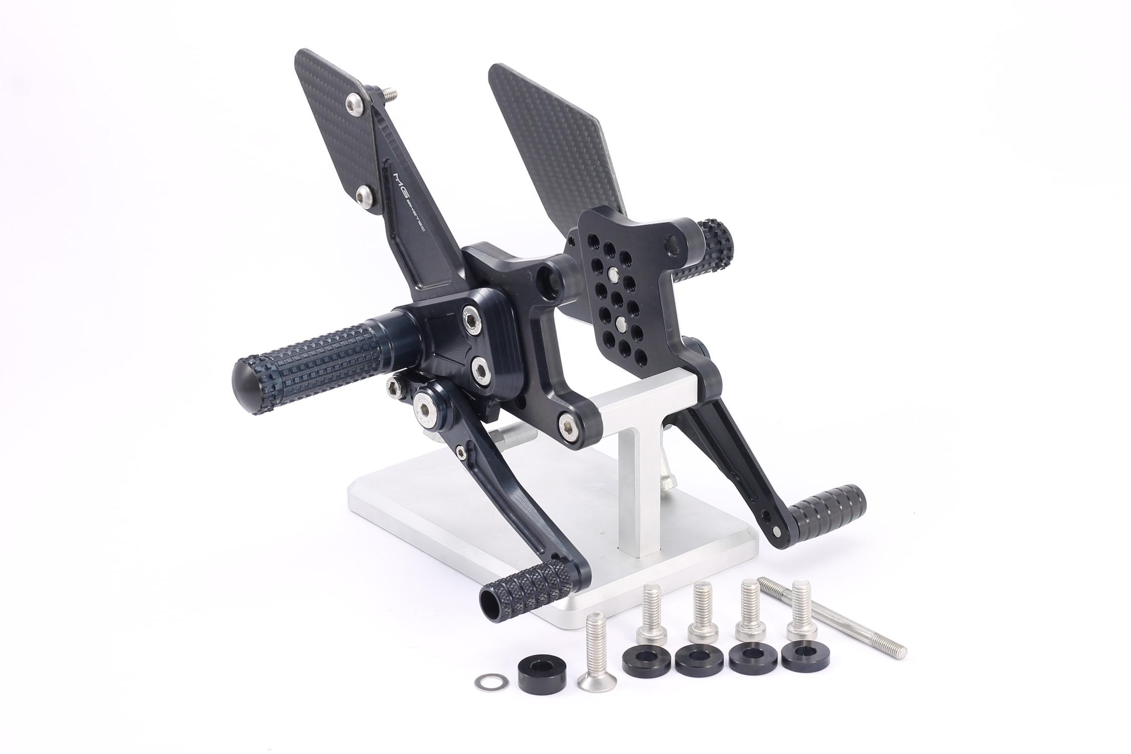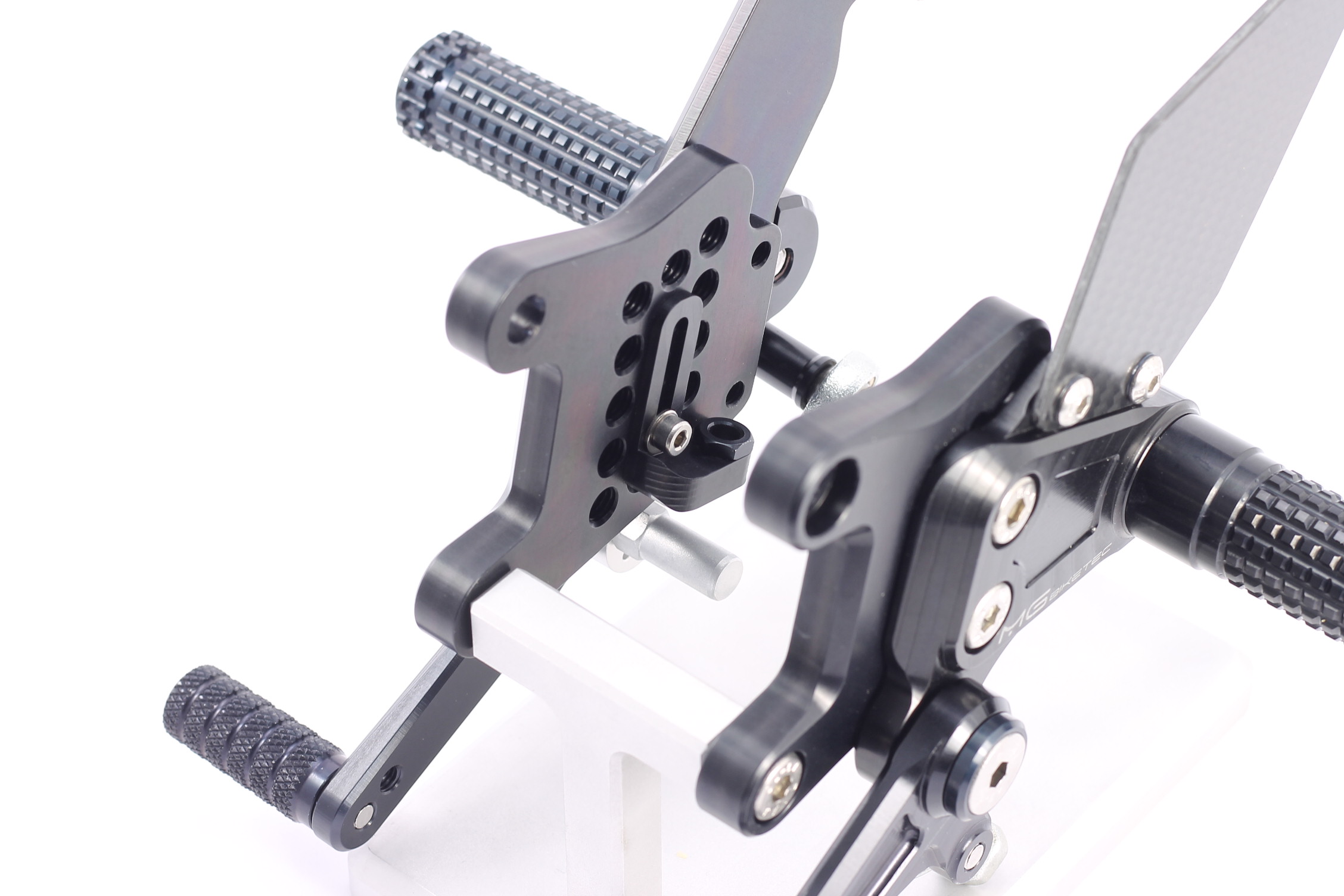 Rennsport erprobte Fussrastenanlage, voll ergonomisch verstellbar in 9 Positionen und bis zu 22 mm