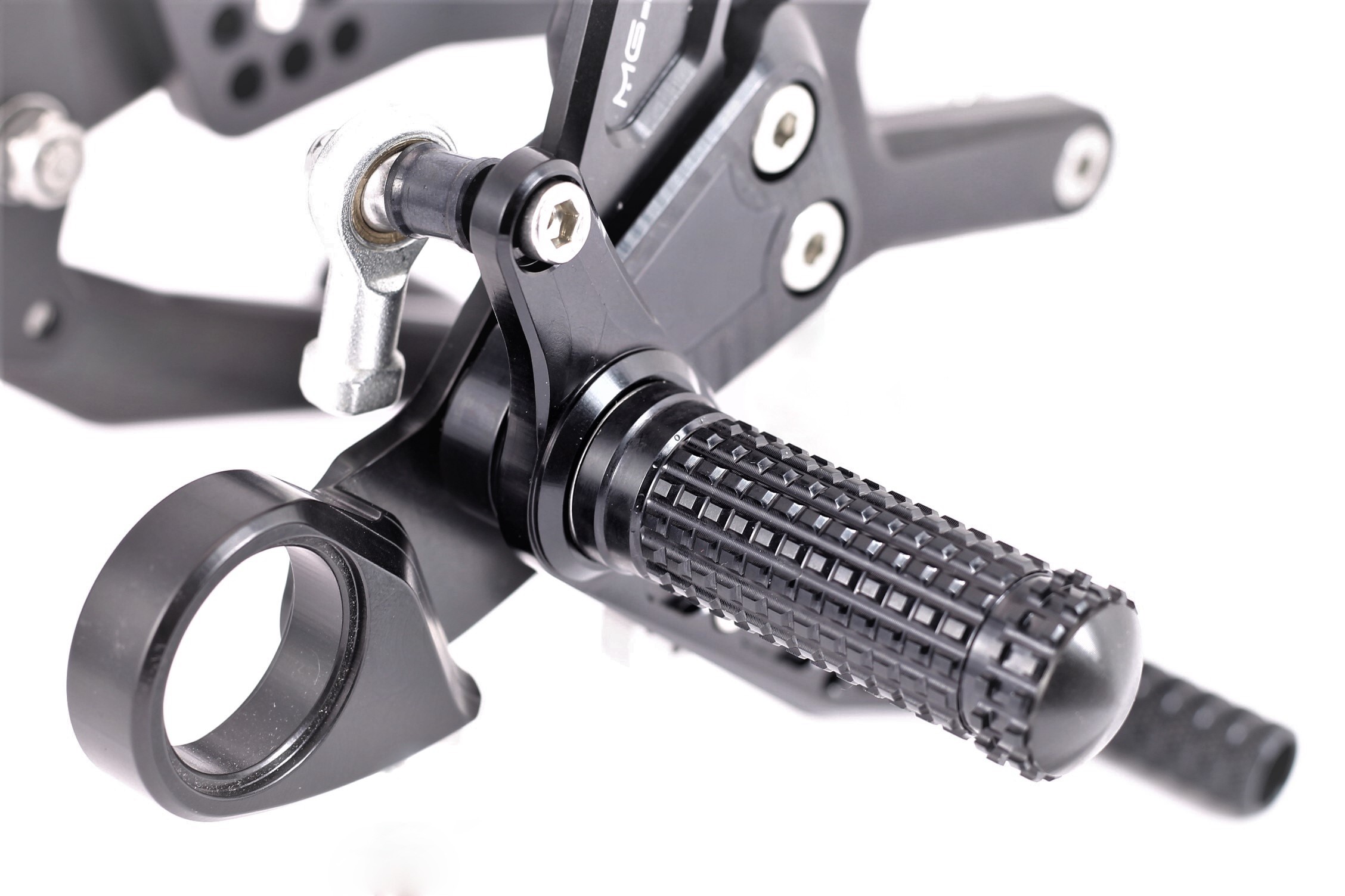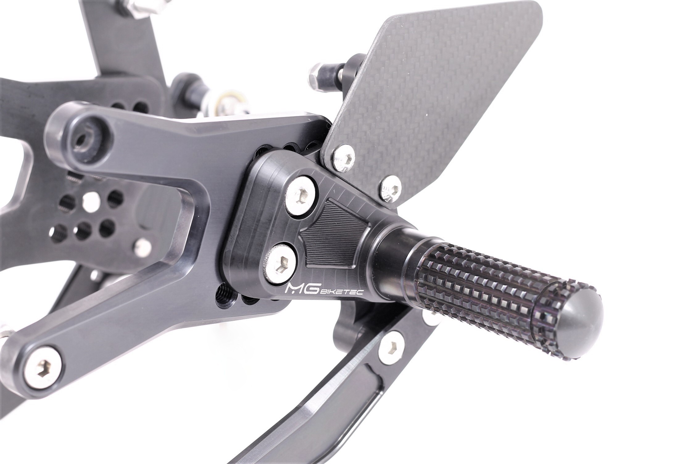 Rennsport erprobte Fussrastenanlage, voll ergonomisch verstellbar in 9 Positionen und bis zu 20 mm