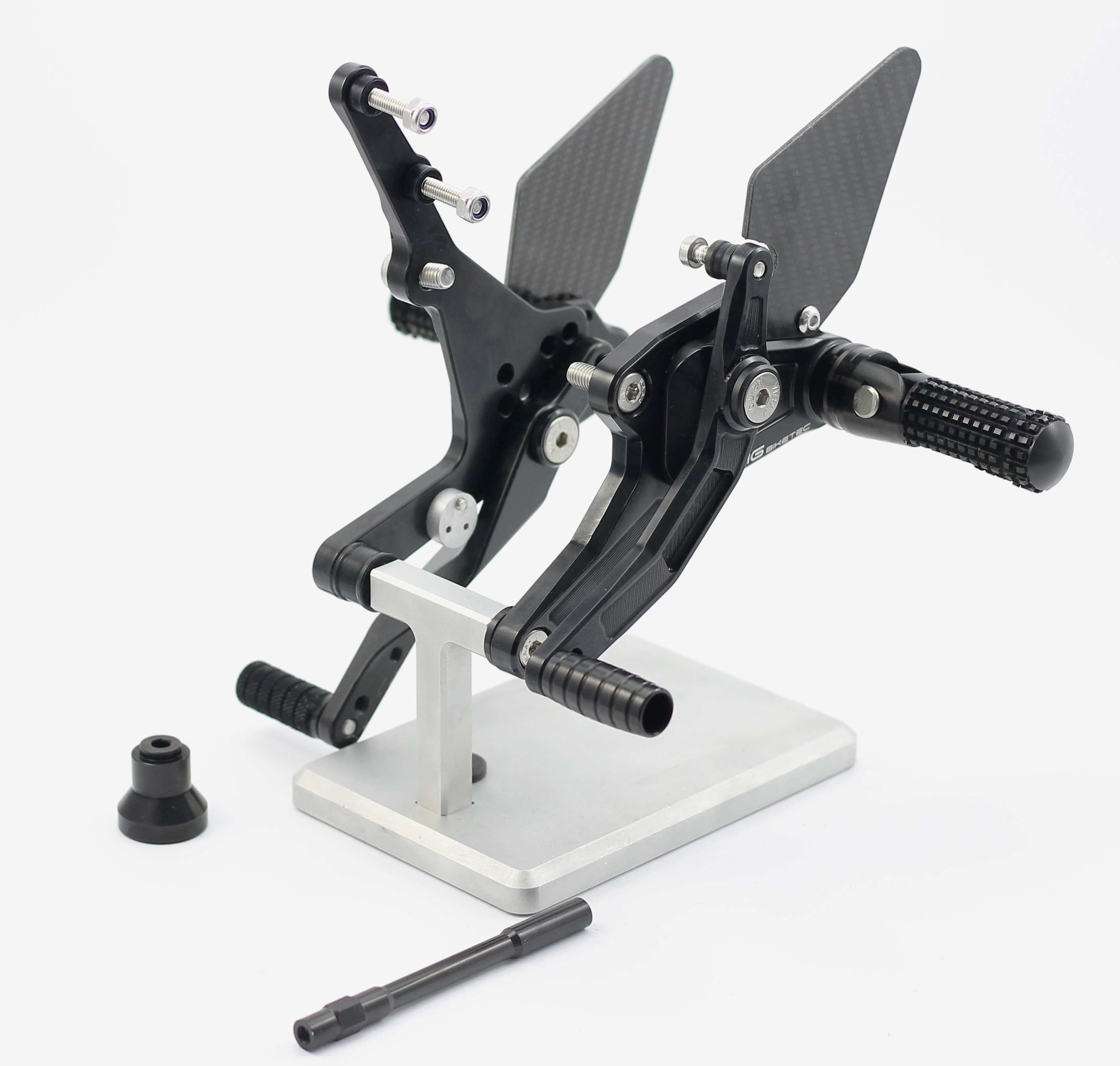 Rennsport erprobte Fussrastenanlage, voll ergonomisch verstellbar in 6 Positionen und bis zu 35 mm
