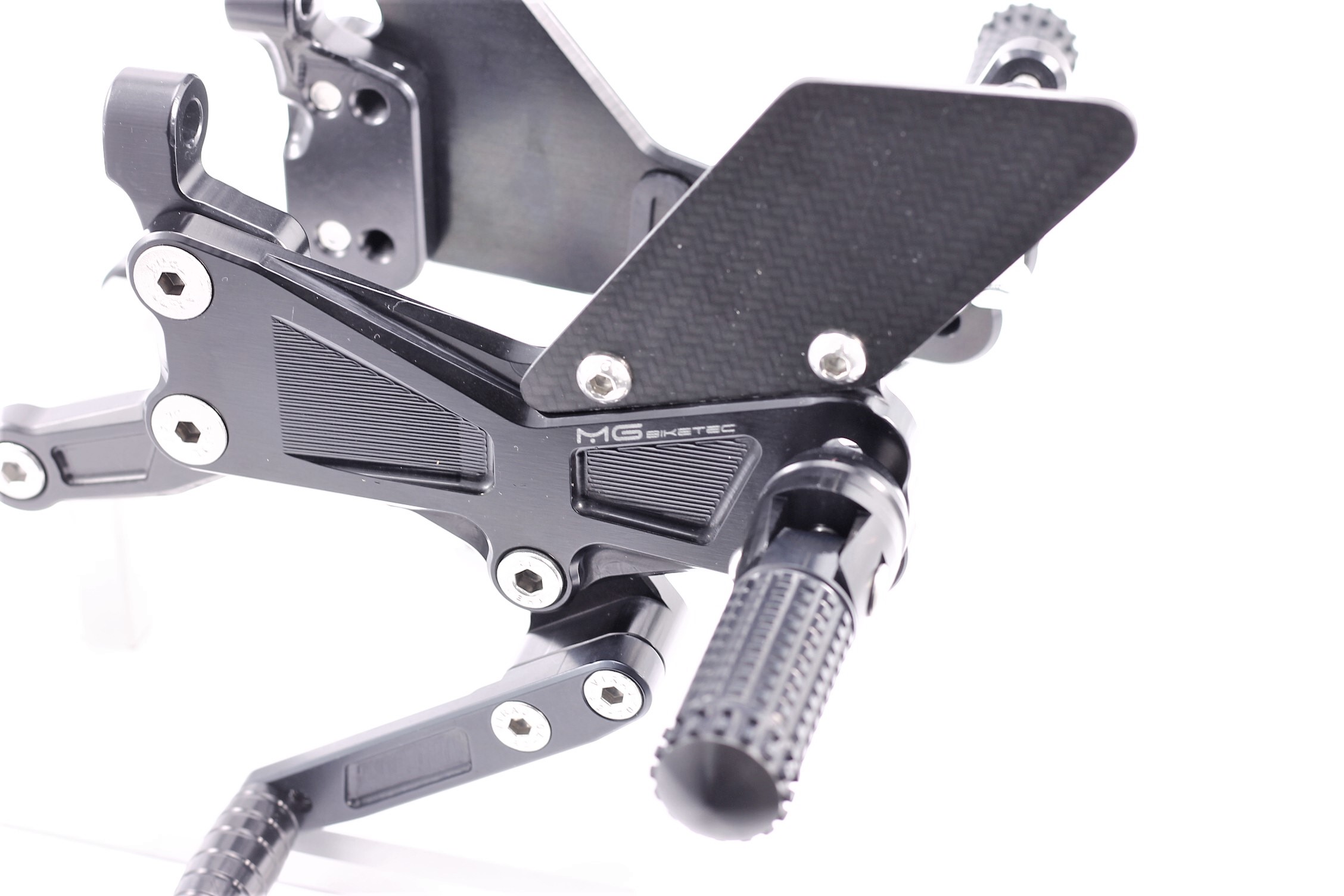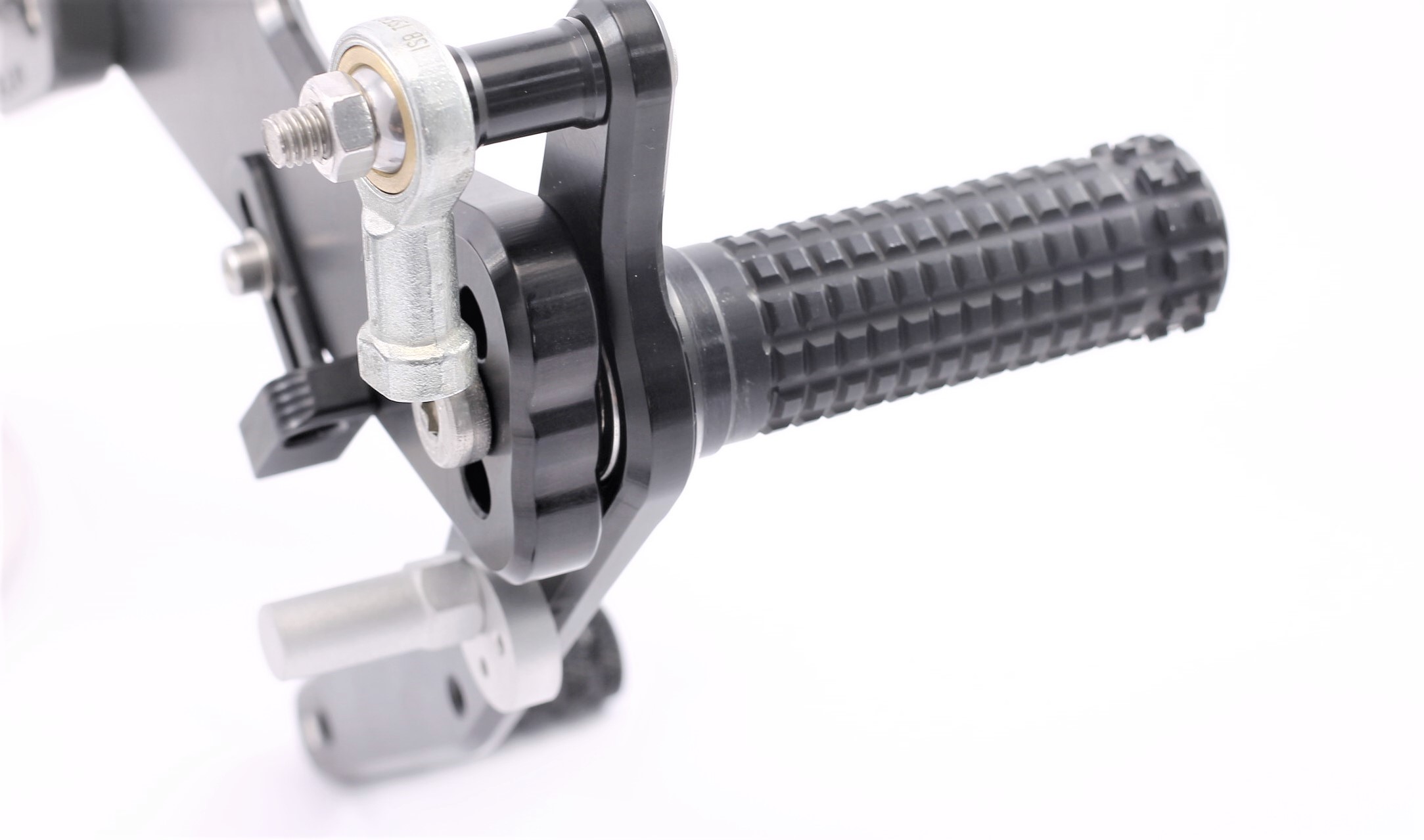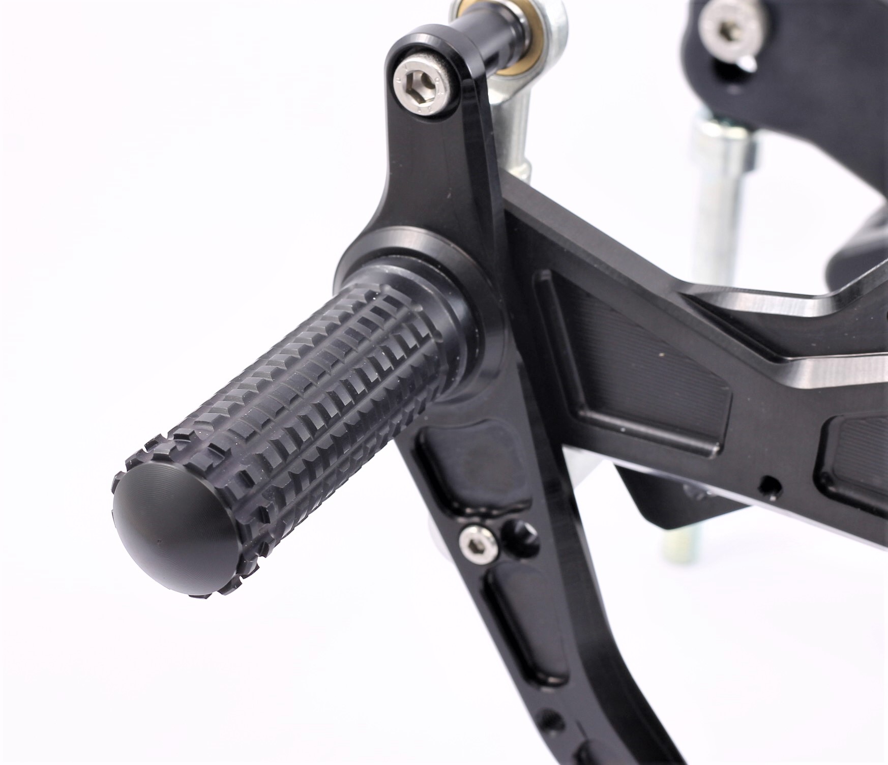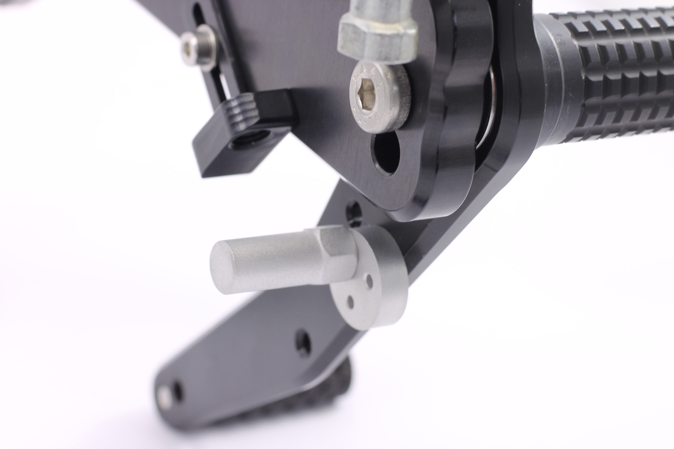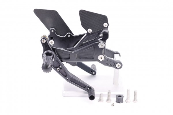 Rennsport erprobte Fussrastenanlage, voll ergonomisch verstellbar in 6 Positionen und bis zu 20 mm