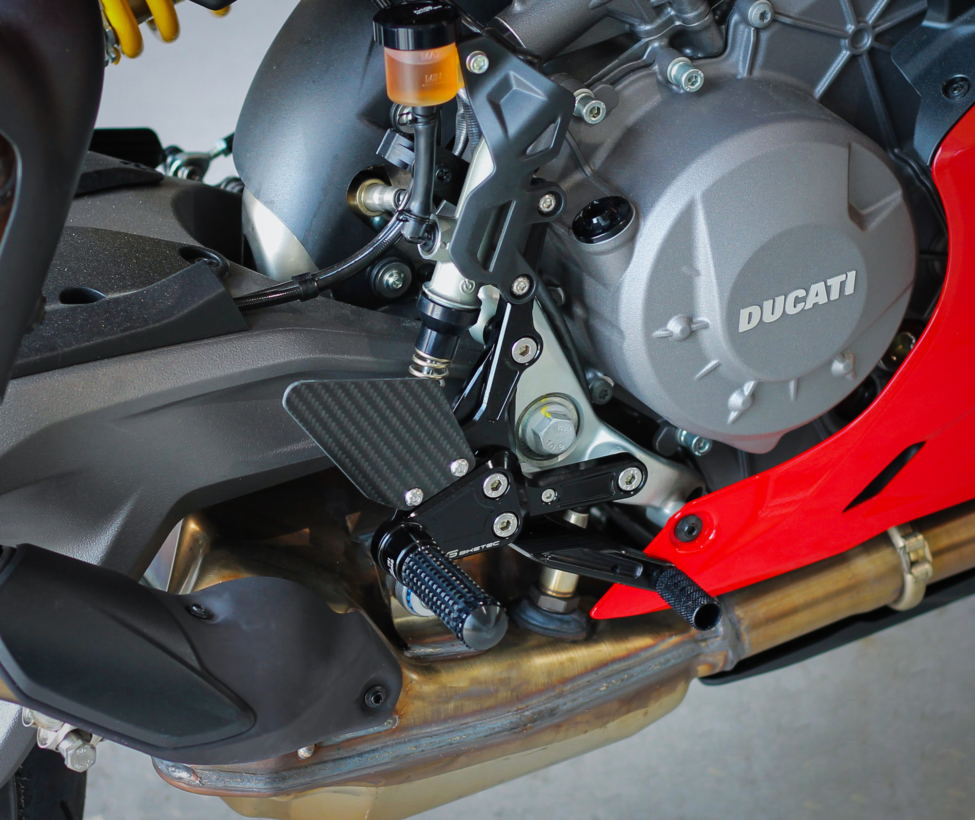 Rennsport erprobte Fussrastenanlage, voll ergonomisch verstellbar in 6 Positionen und bis zu 35 mm