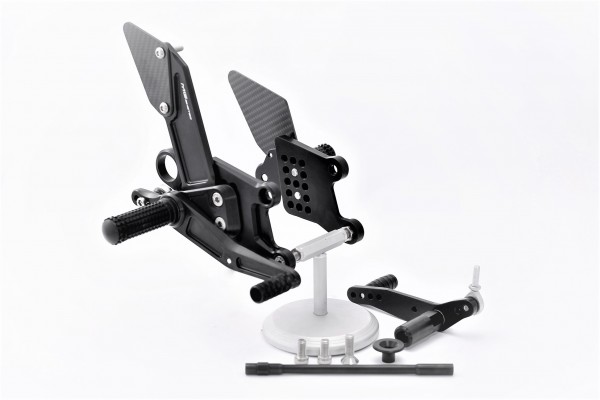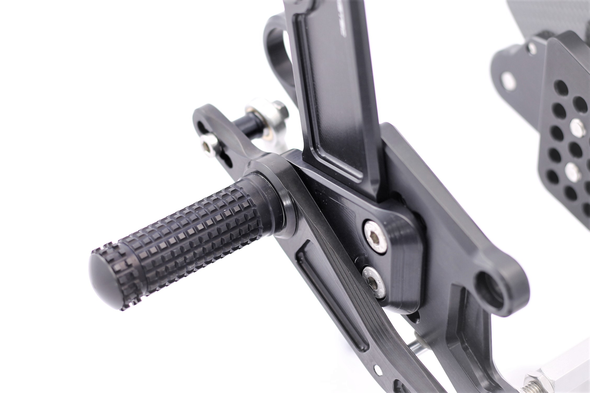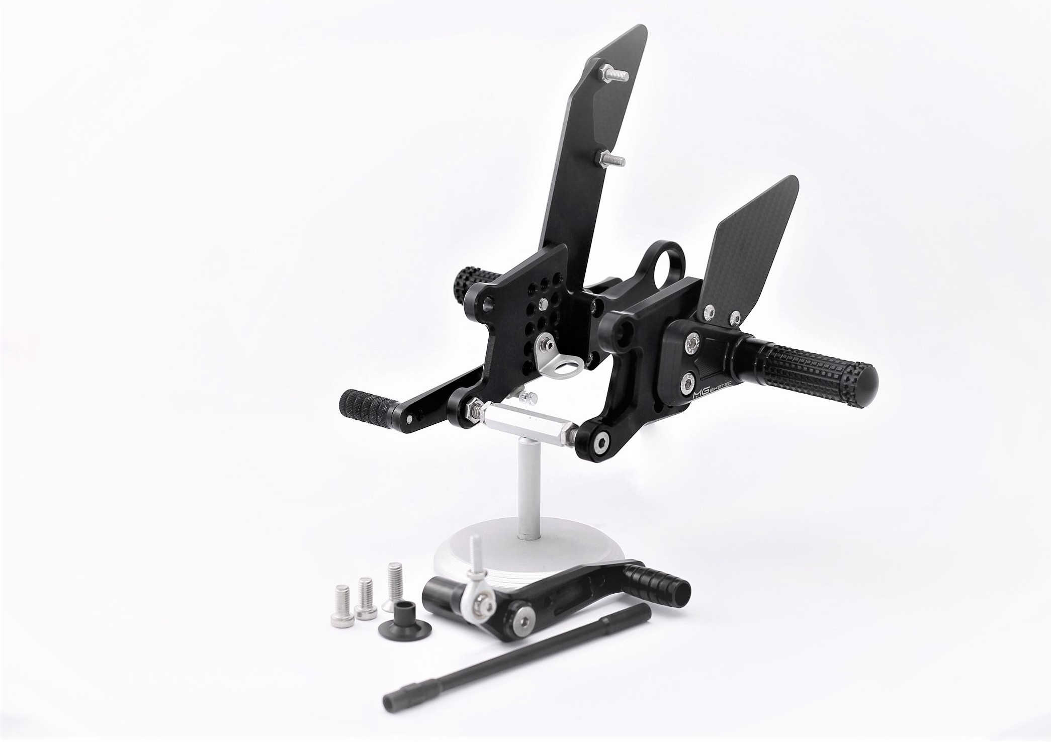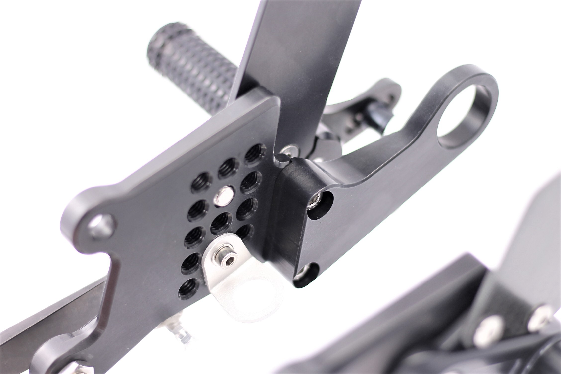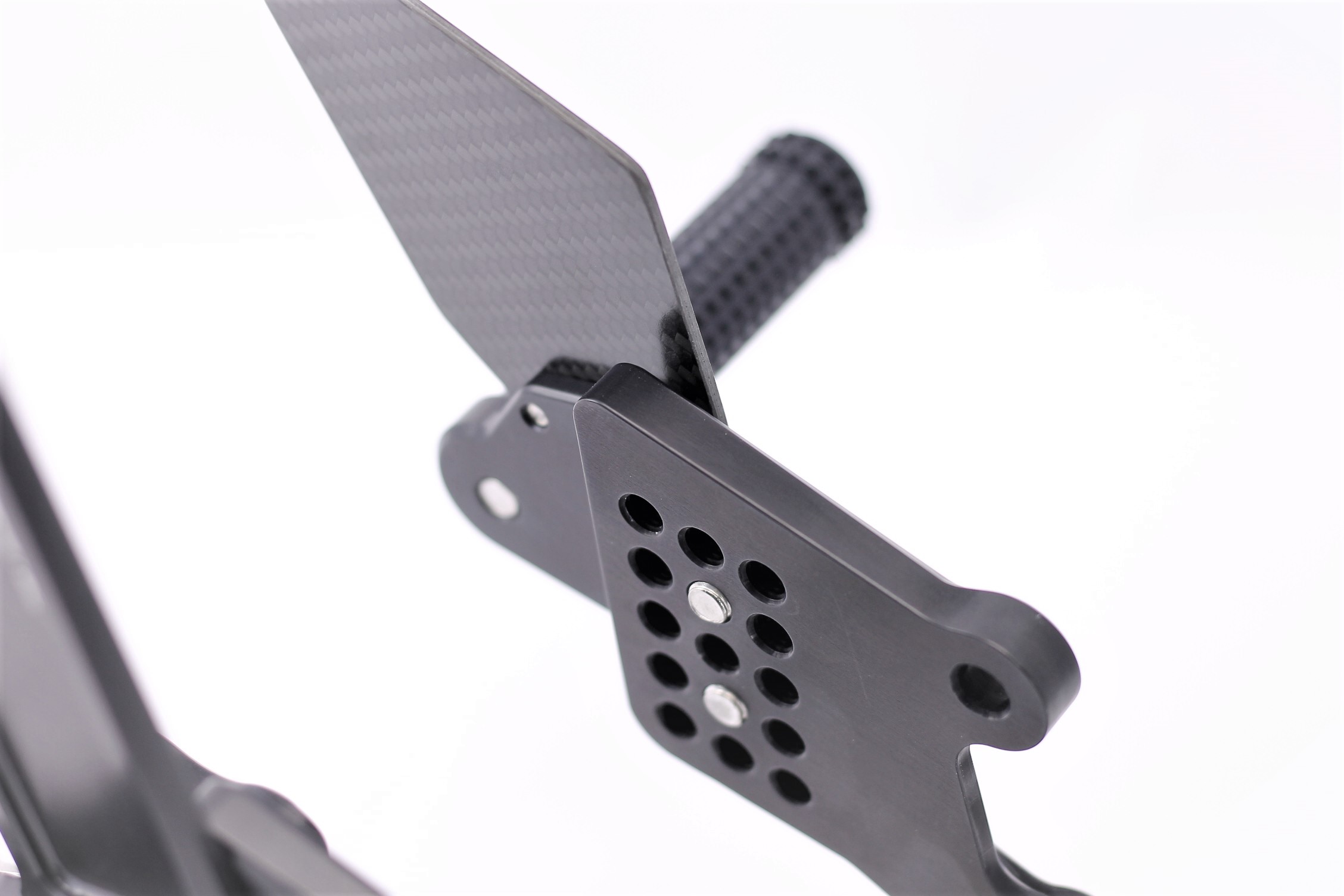 Rennsport erprobte Fussrastenanlage, voll ergonomisch verstellbar in 9 Positionen und bis zu 20 mm