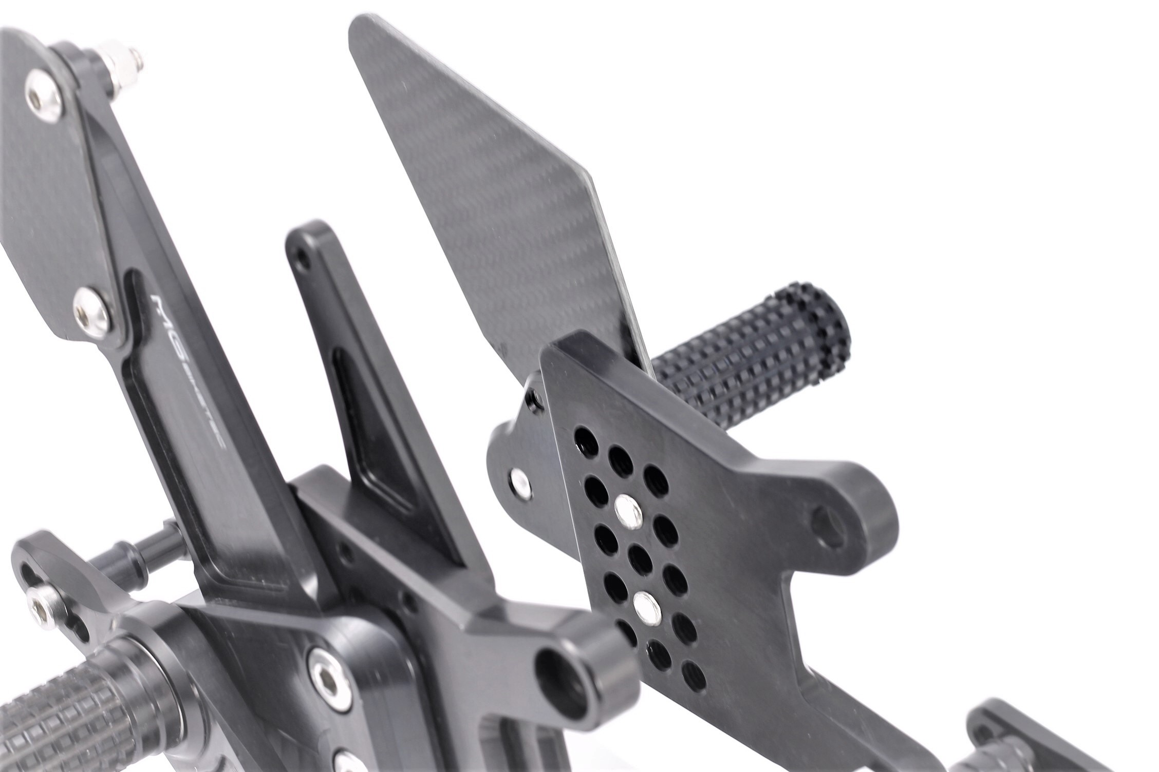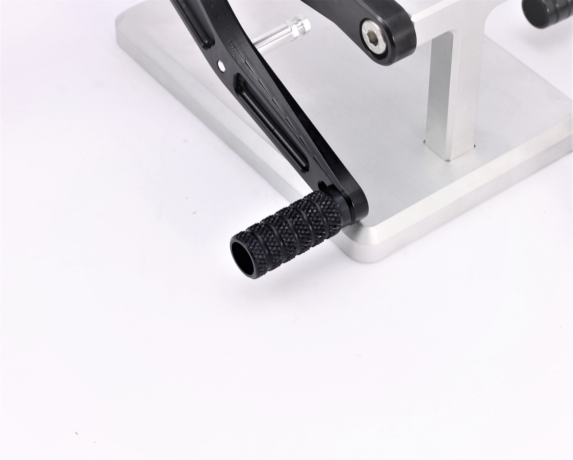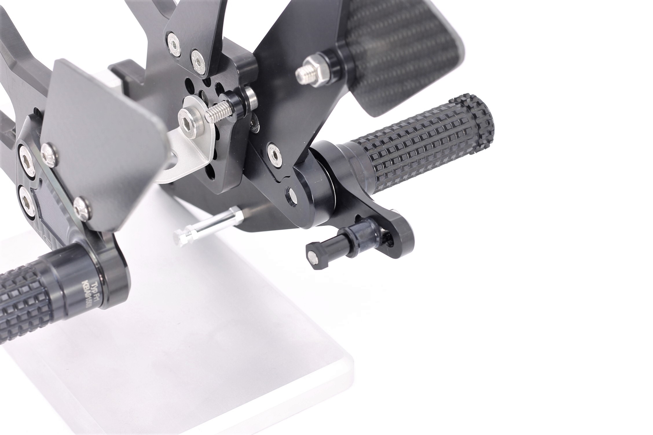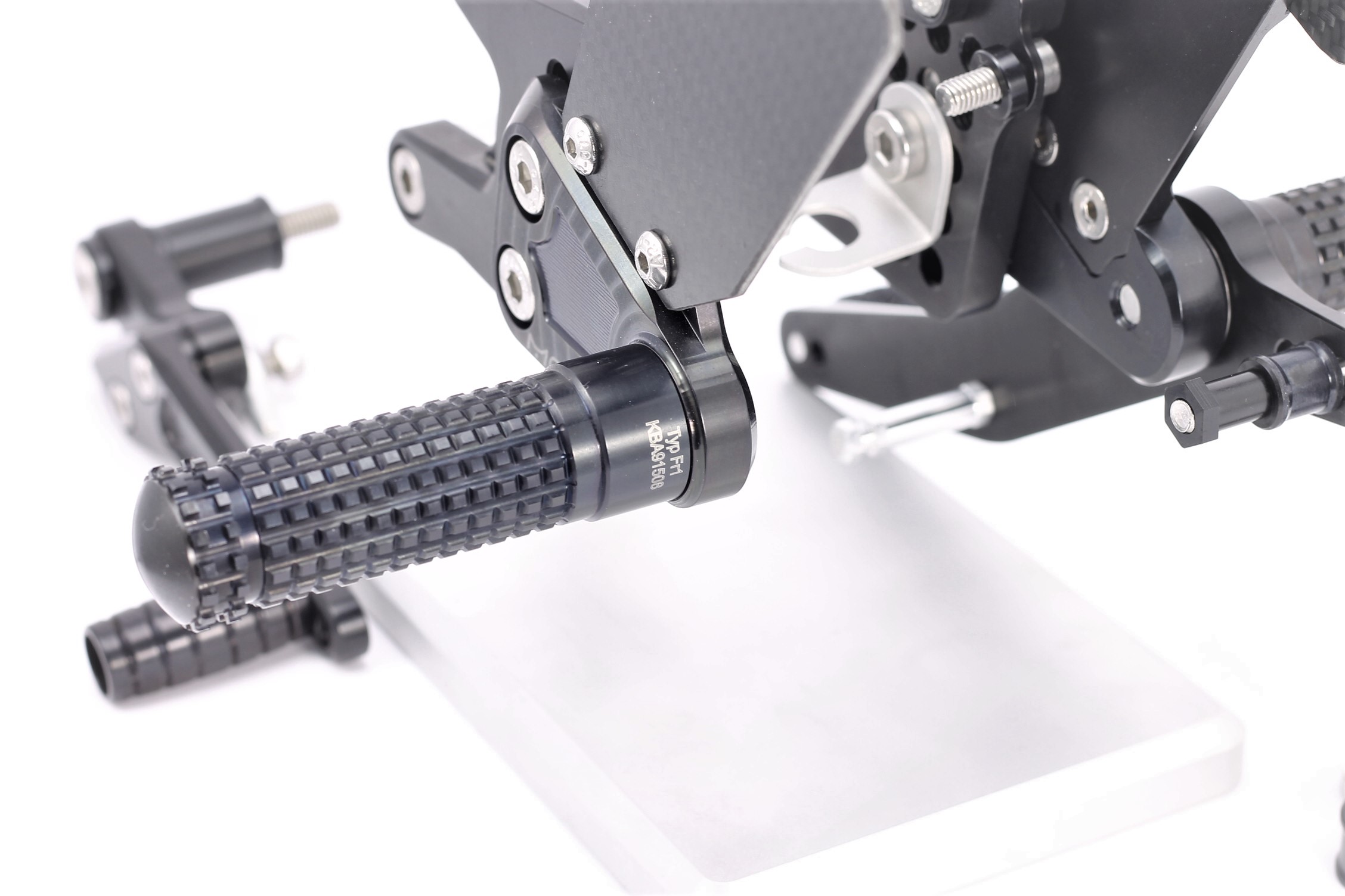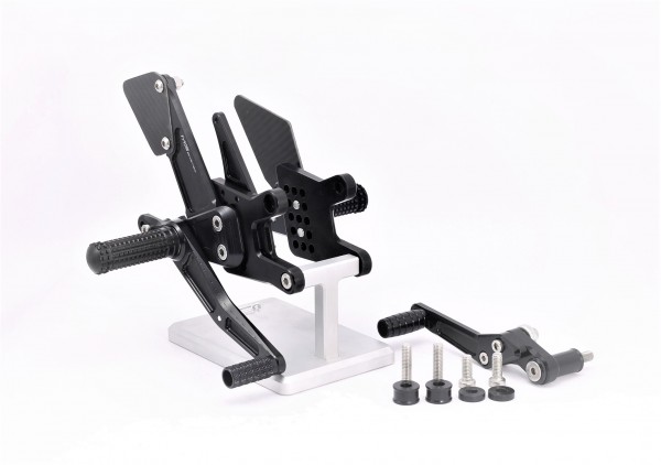 Rennsport erprobte Fussrastenanlage, voll ergonomisch verstellbar in 9 Positionen und bis zu 20 mm