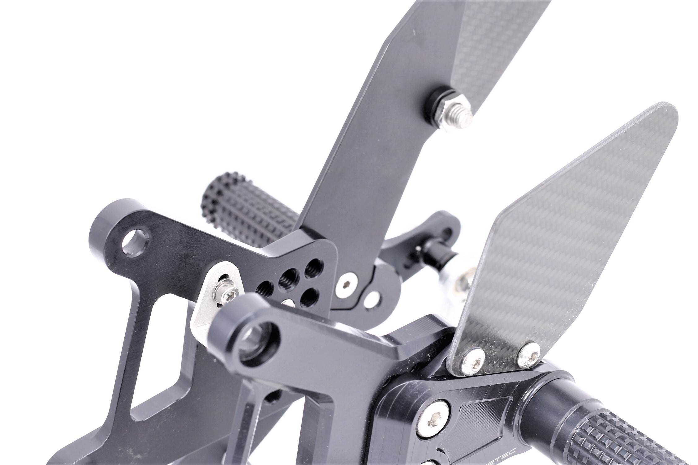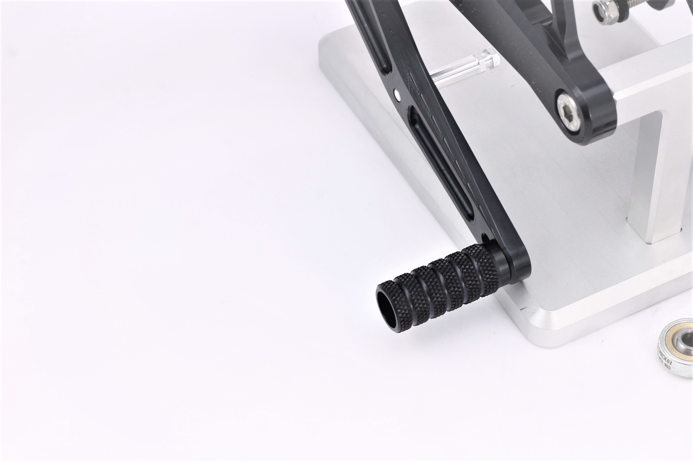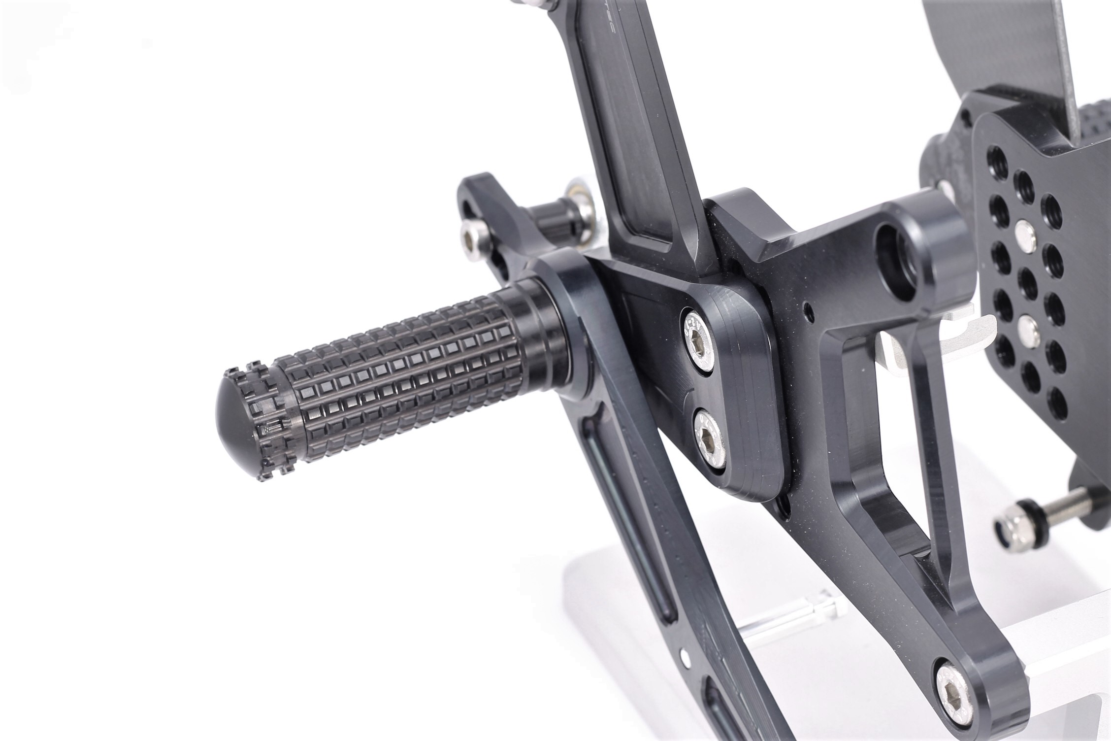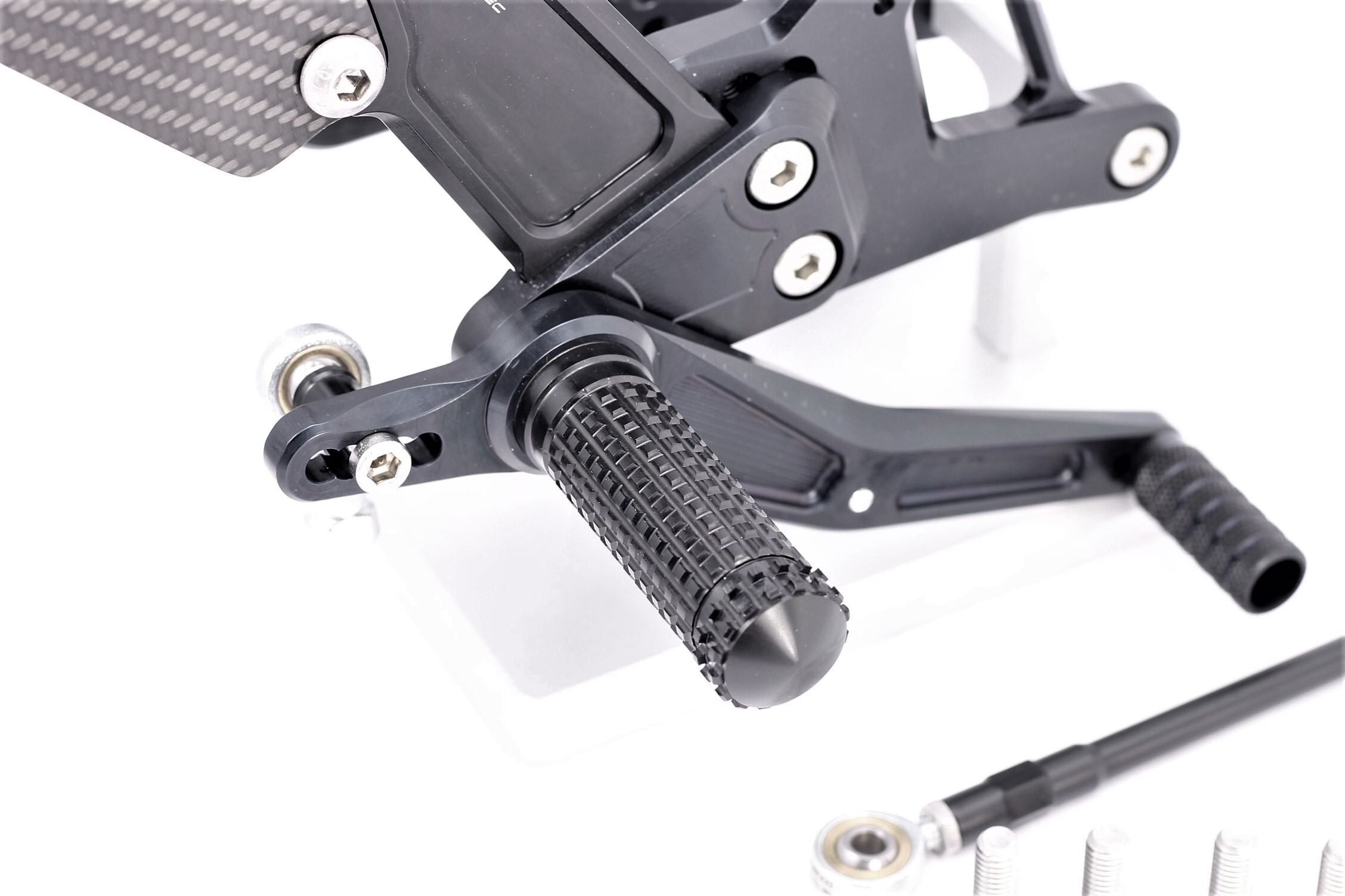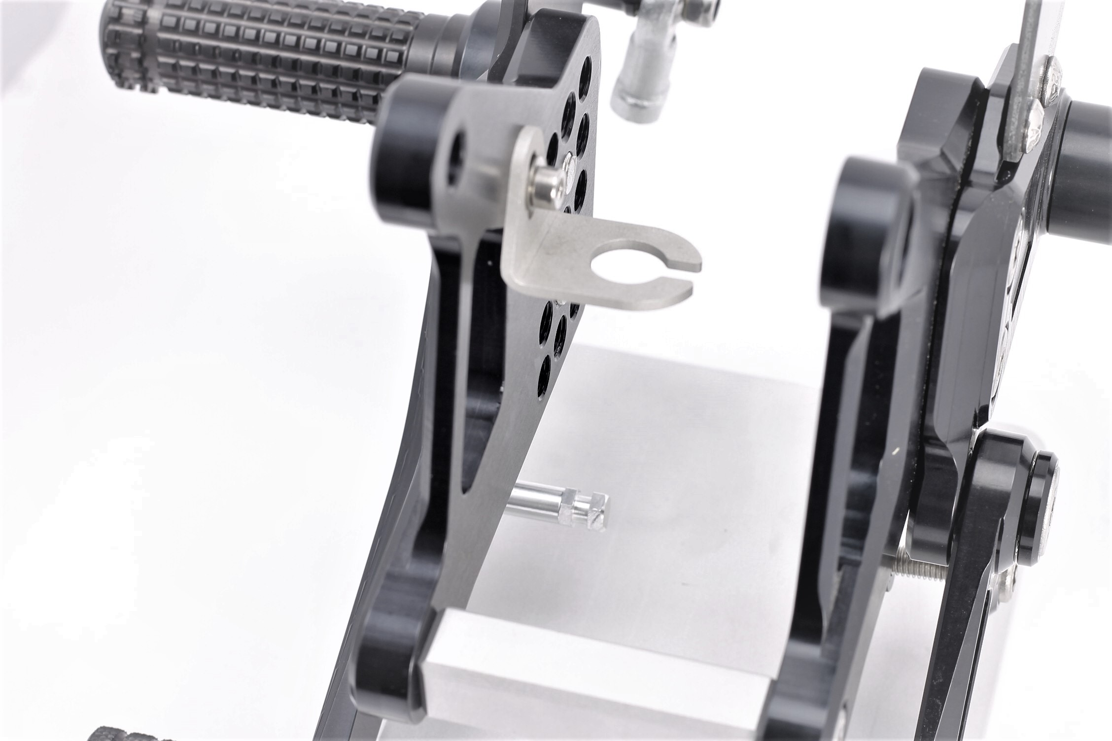 Rennsport erprobte Fussrastenanlage, voll ergonomisch verstellbar in 9 Positionen und bis zu 20 mm