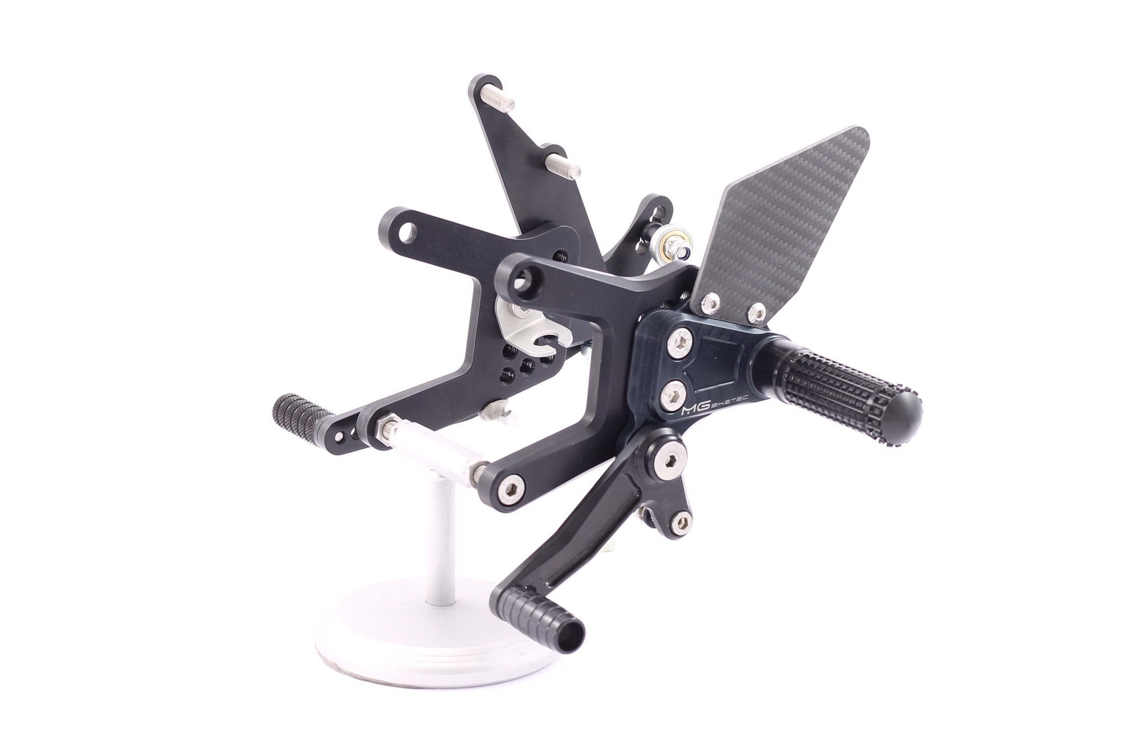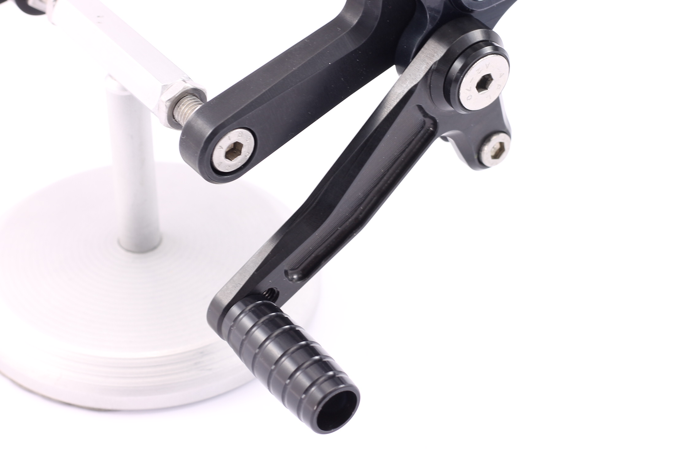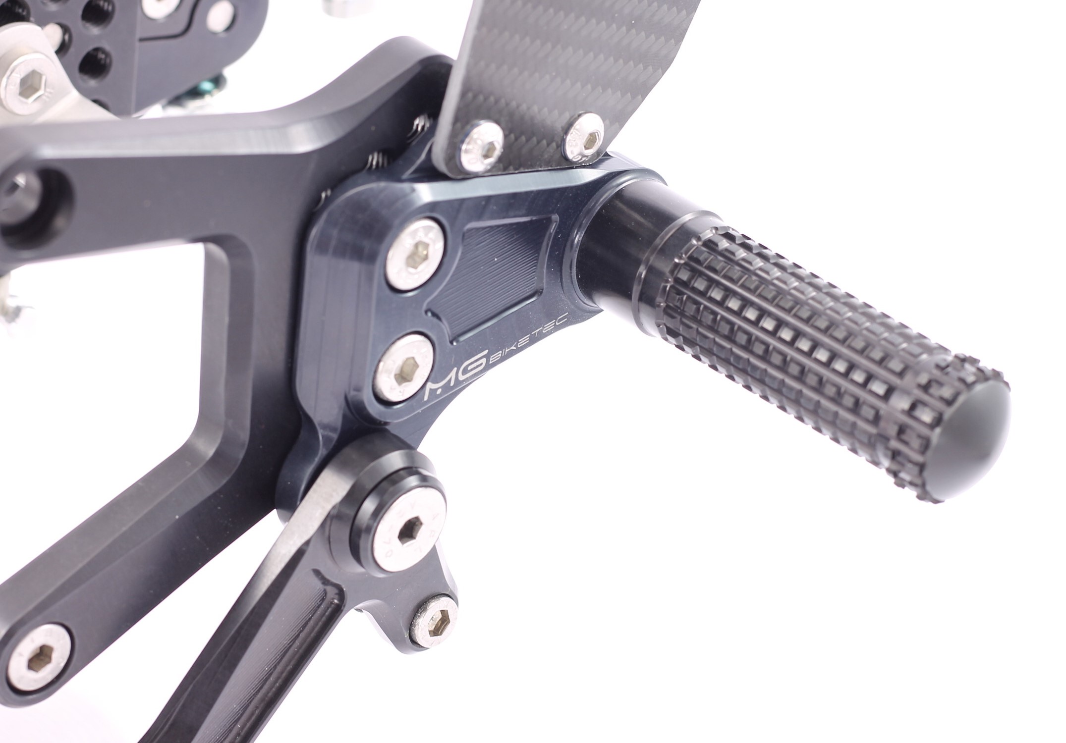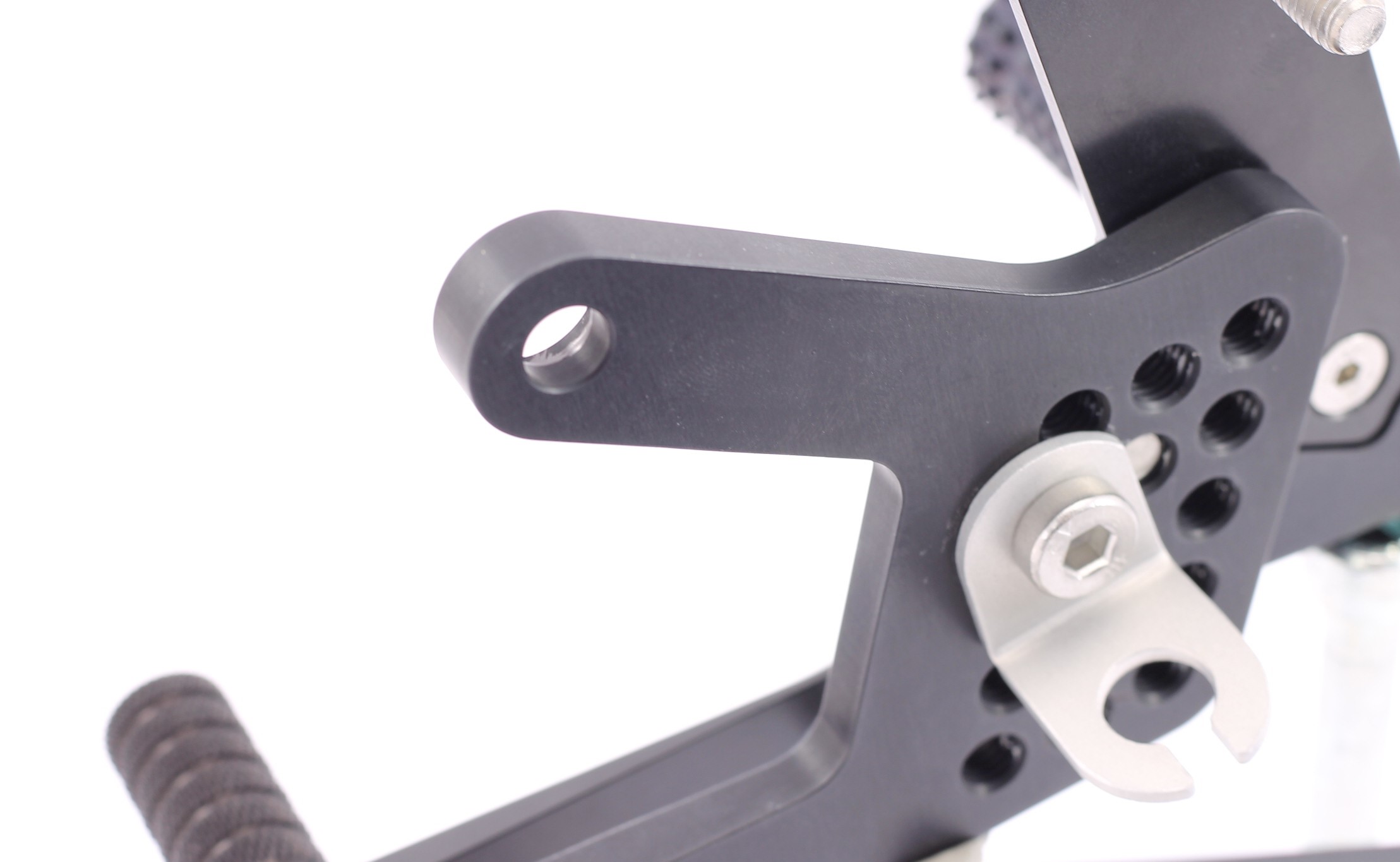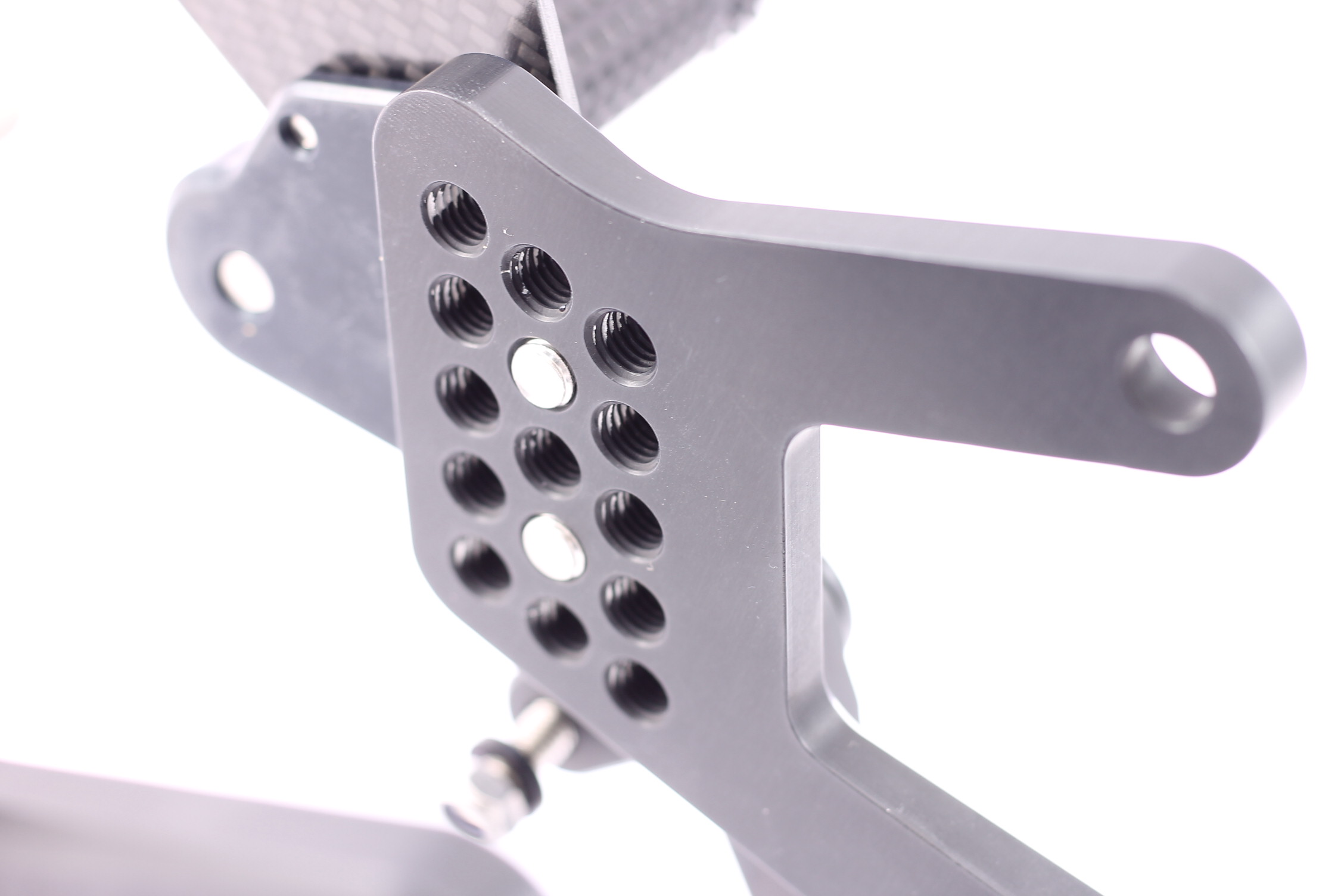 Rennsport erprobte Fussrastenanlage, voll ergonomisch verstellbar in 9 Positionen und bis zu 20 mm
