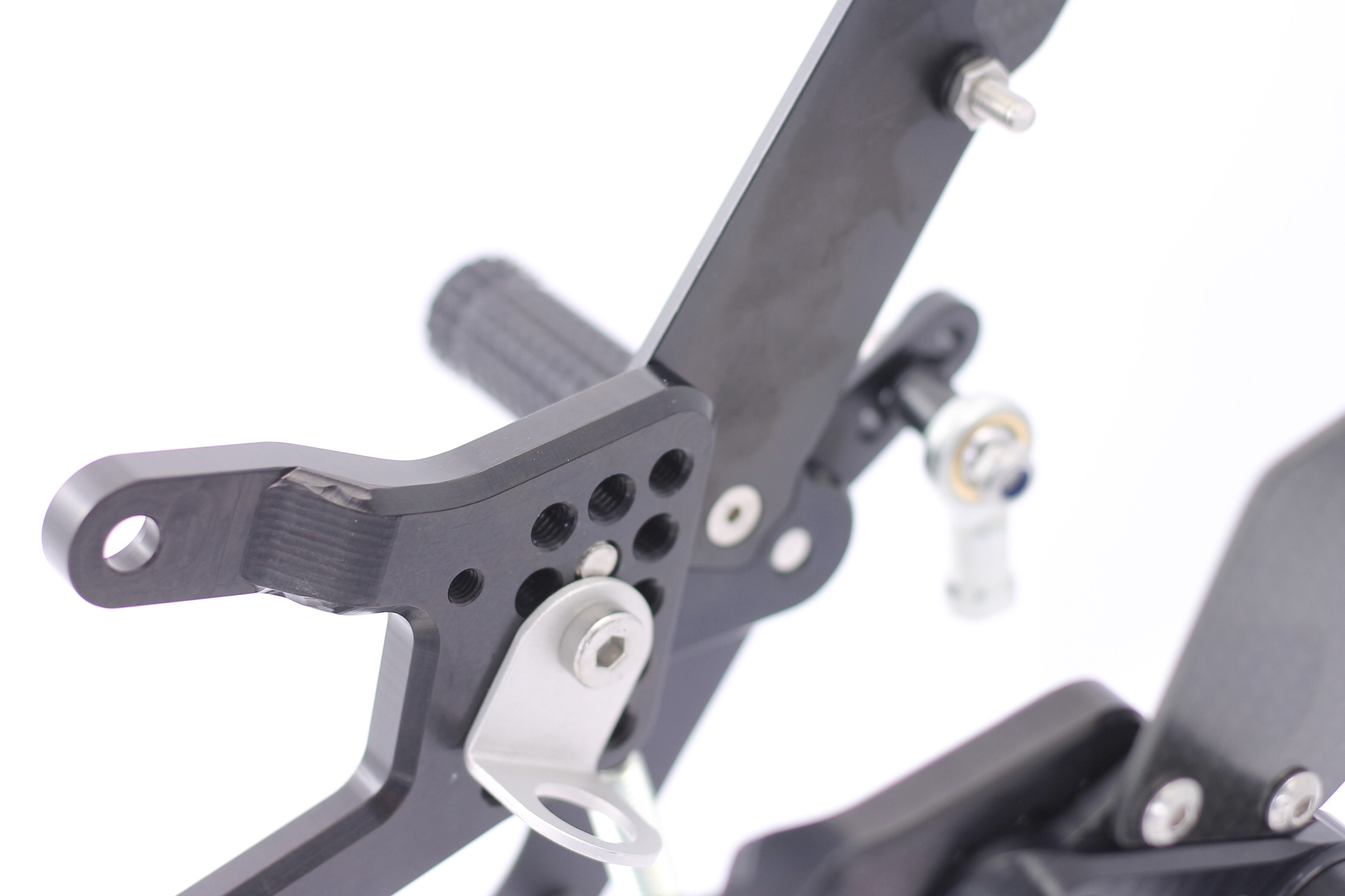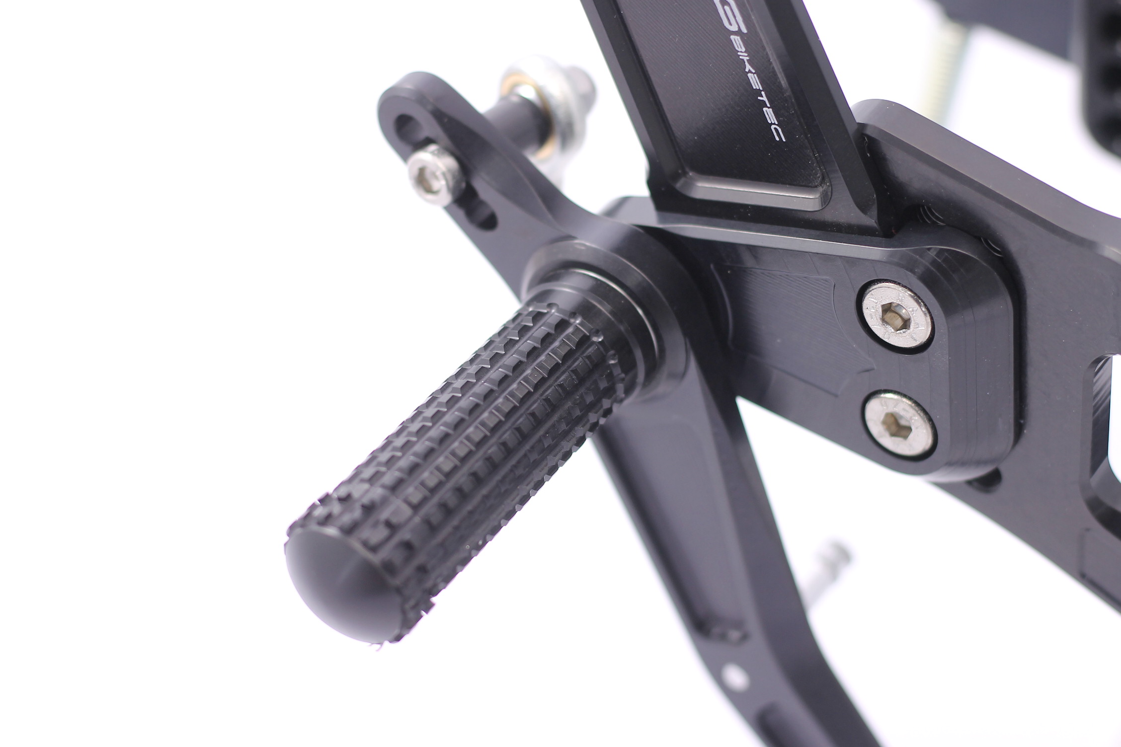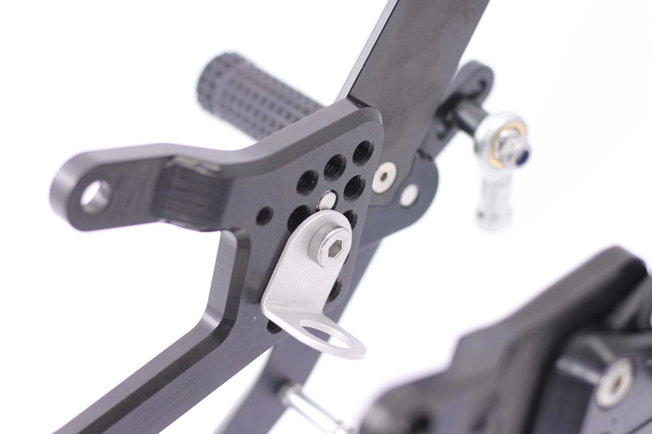Rennsport erprobte Fussrastenanlage, voll ergonomisch verstellbar in 9 Positionen und bis zu 20 mm