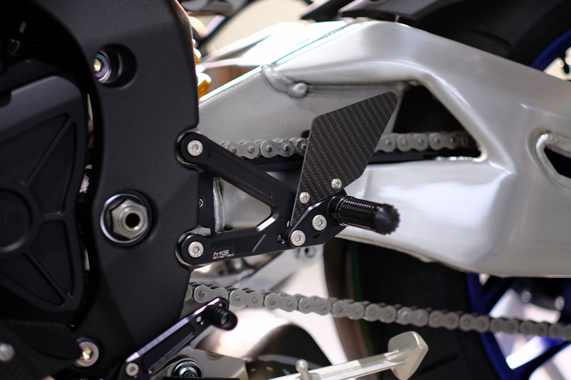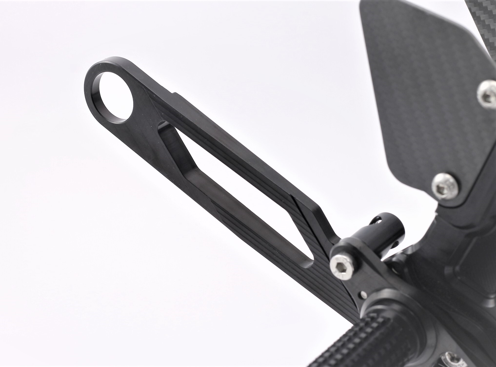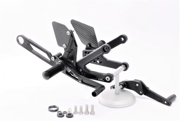 Rennsport erprobte Fussrastenanlage, voll ergonomisch verstellbar in 7 Positionen und bis zu 20 mm