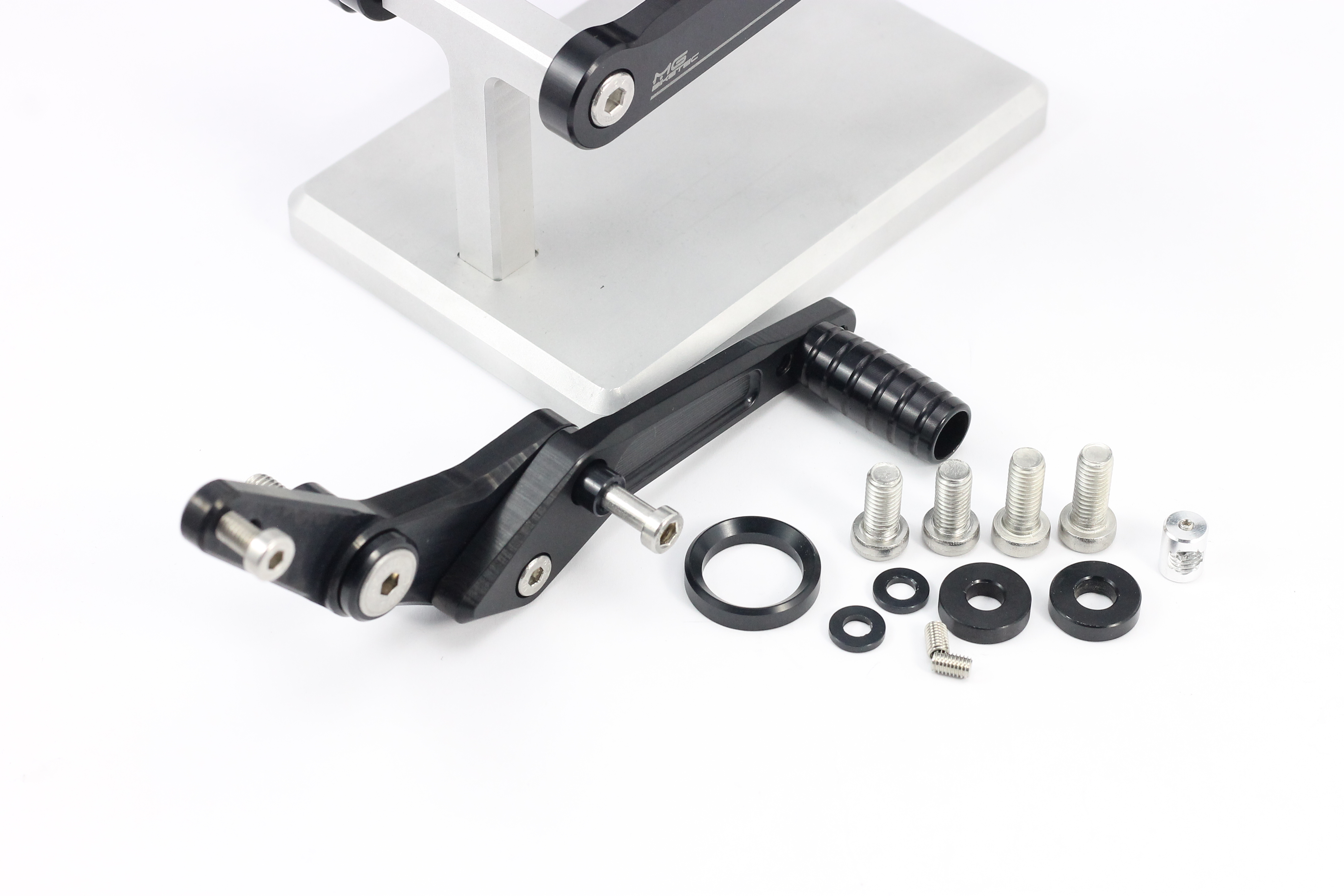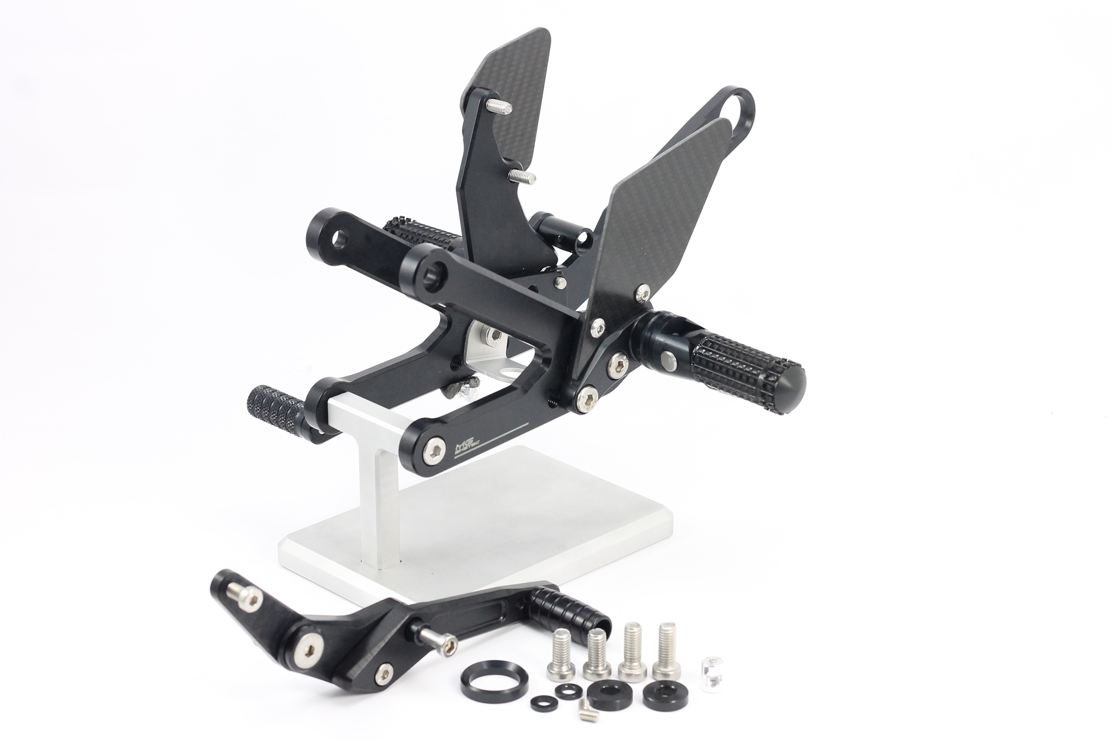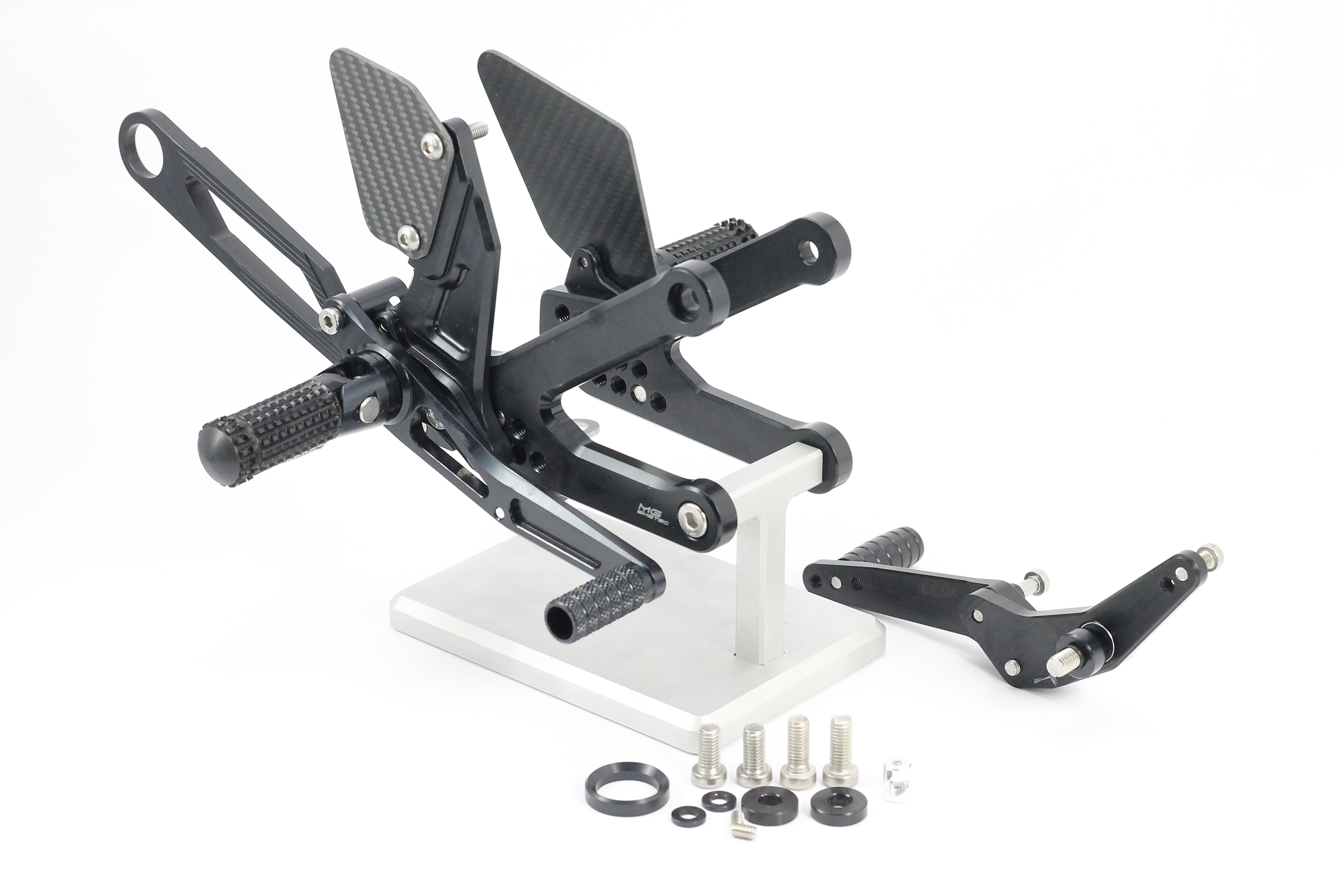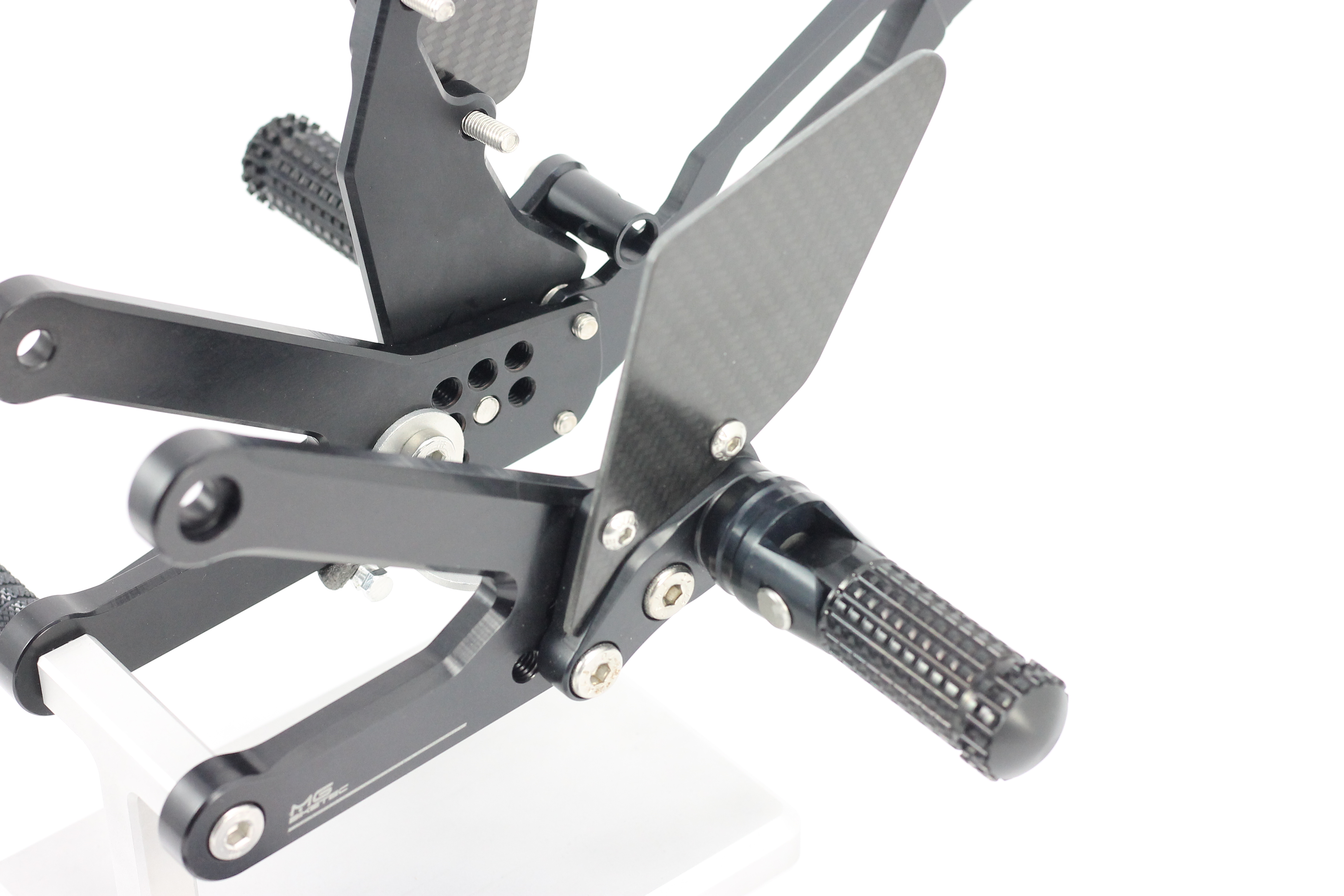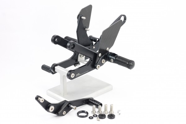 Rennsport erprobte Fussrastenanlage, voll ergonomisch verstellbar in 9 Positionen und bis zu 20 mm