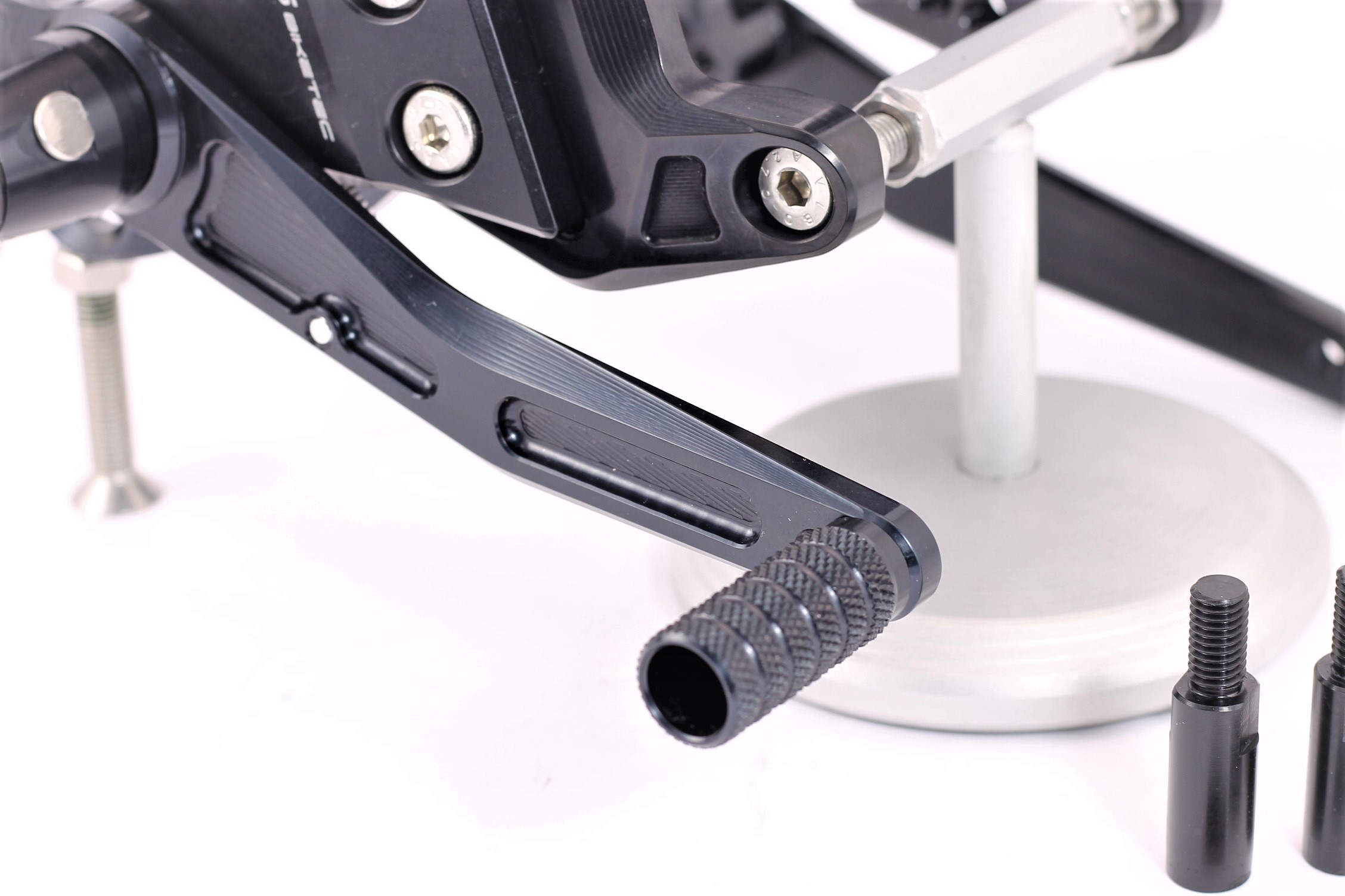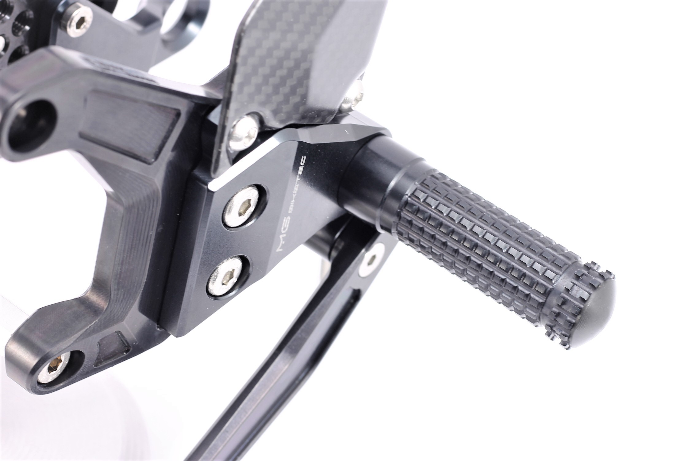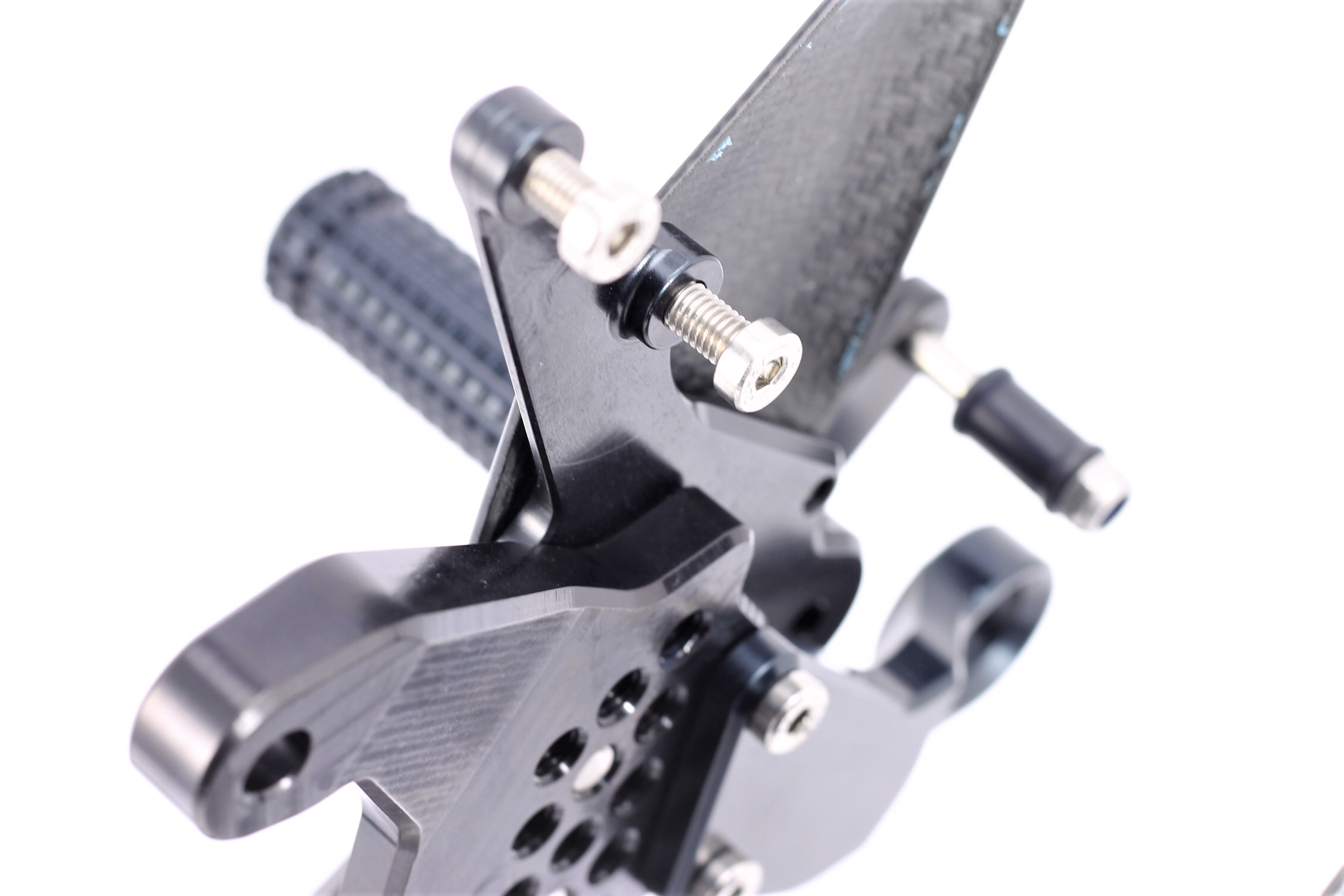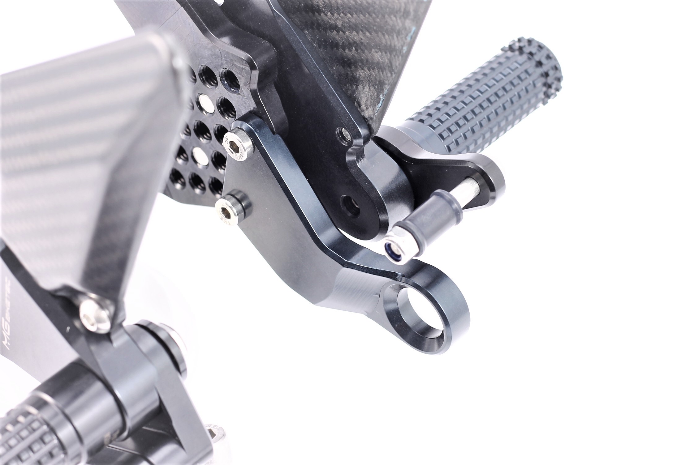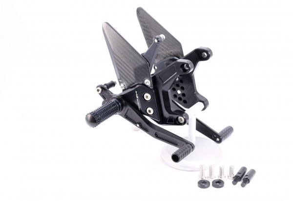 Sistema de reposapiés racing, completamente ajustable ergonómicamente en 18 posiciones y hasta 45 mm.