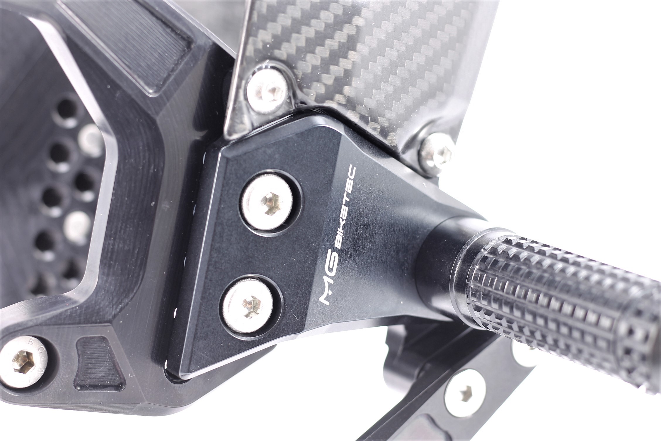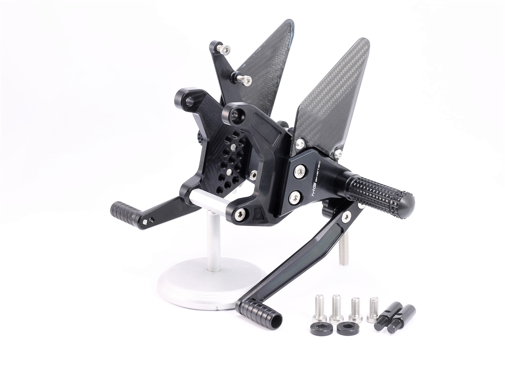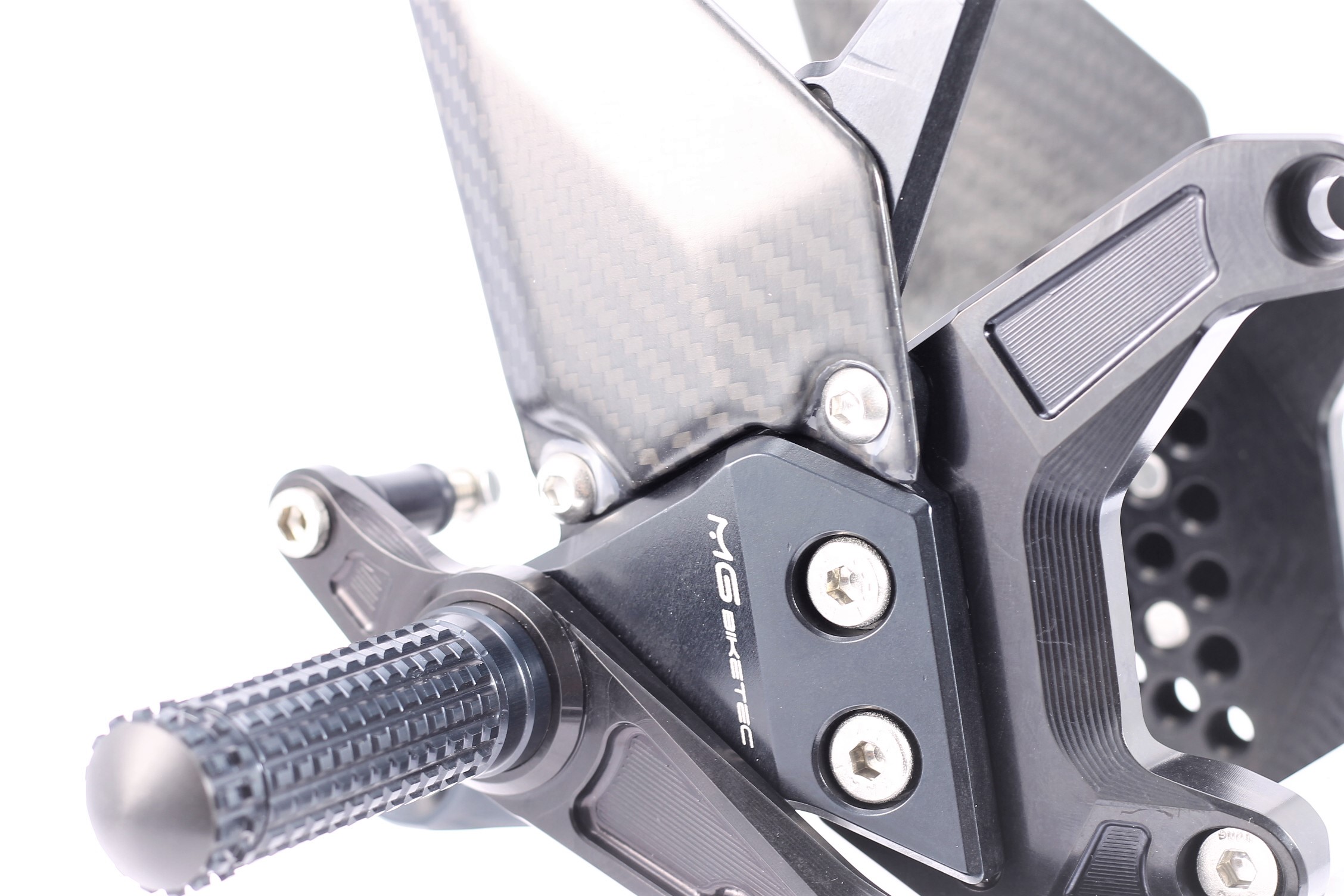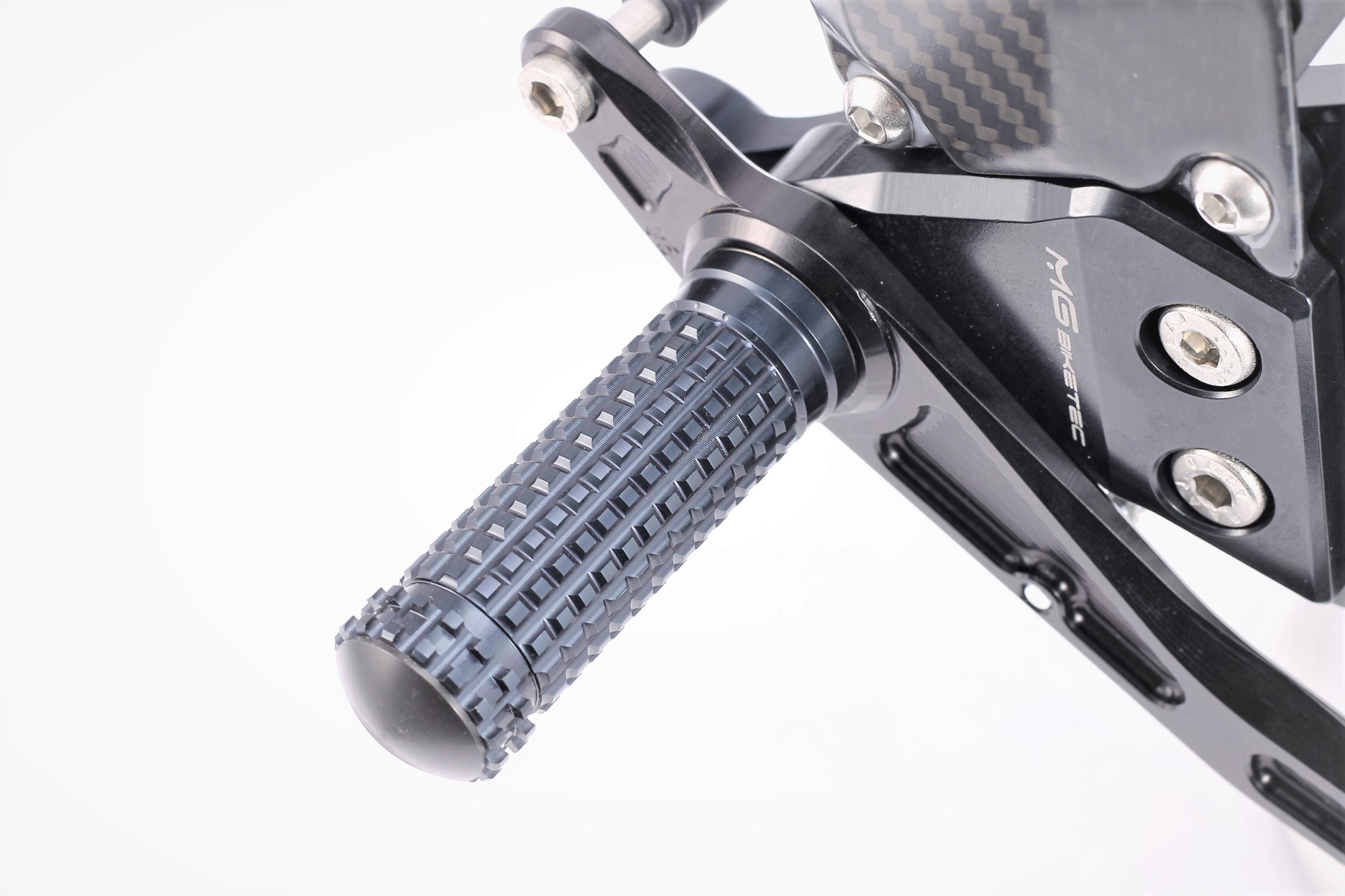 Sistema de reposapiés racing, completamente ajustable ergonómicamente en 18 posiciones y hasta 45 mm.