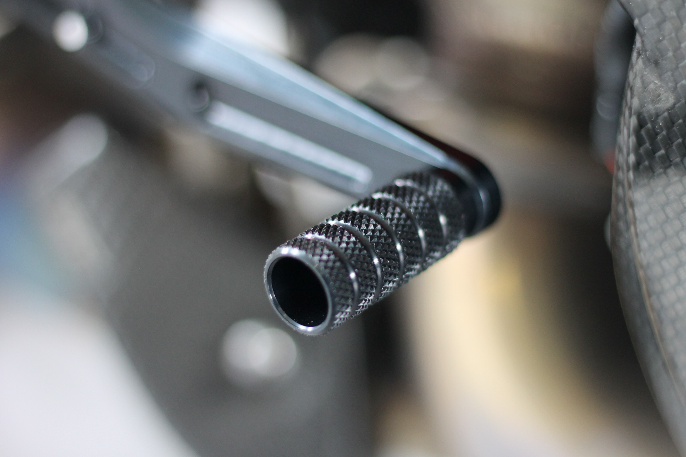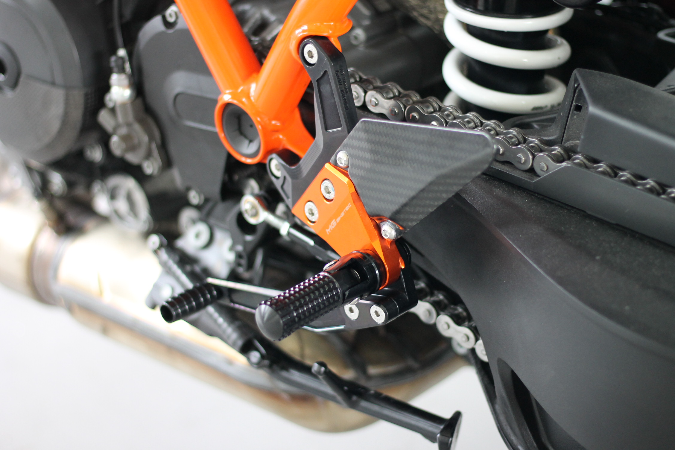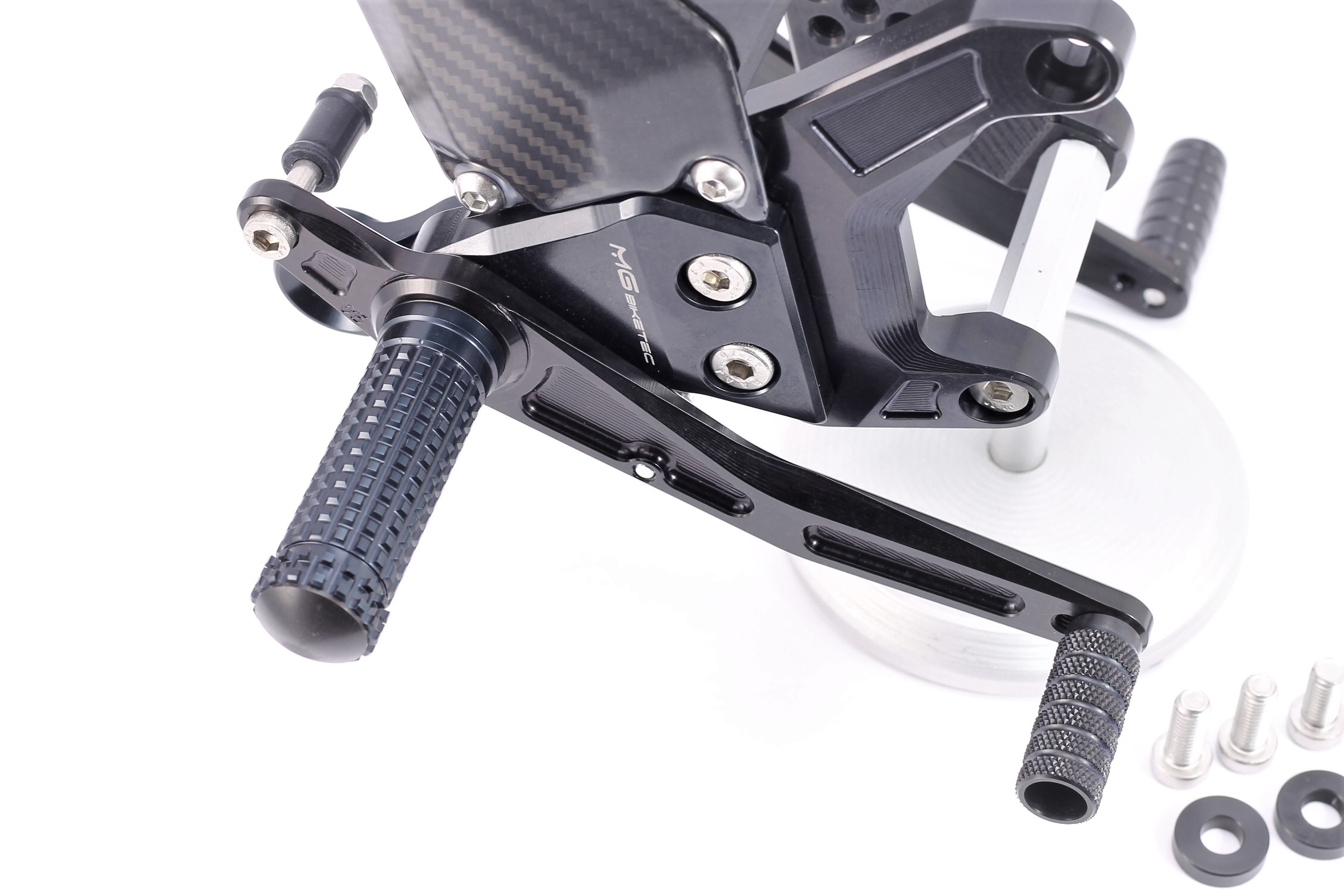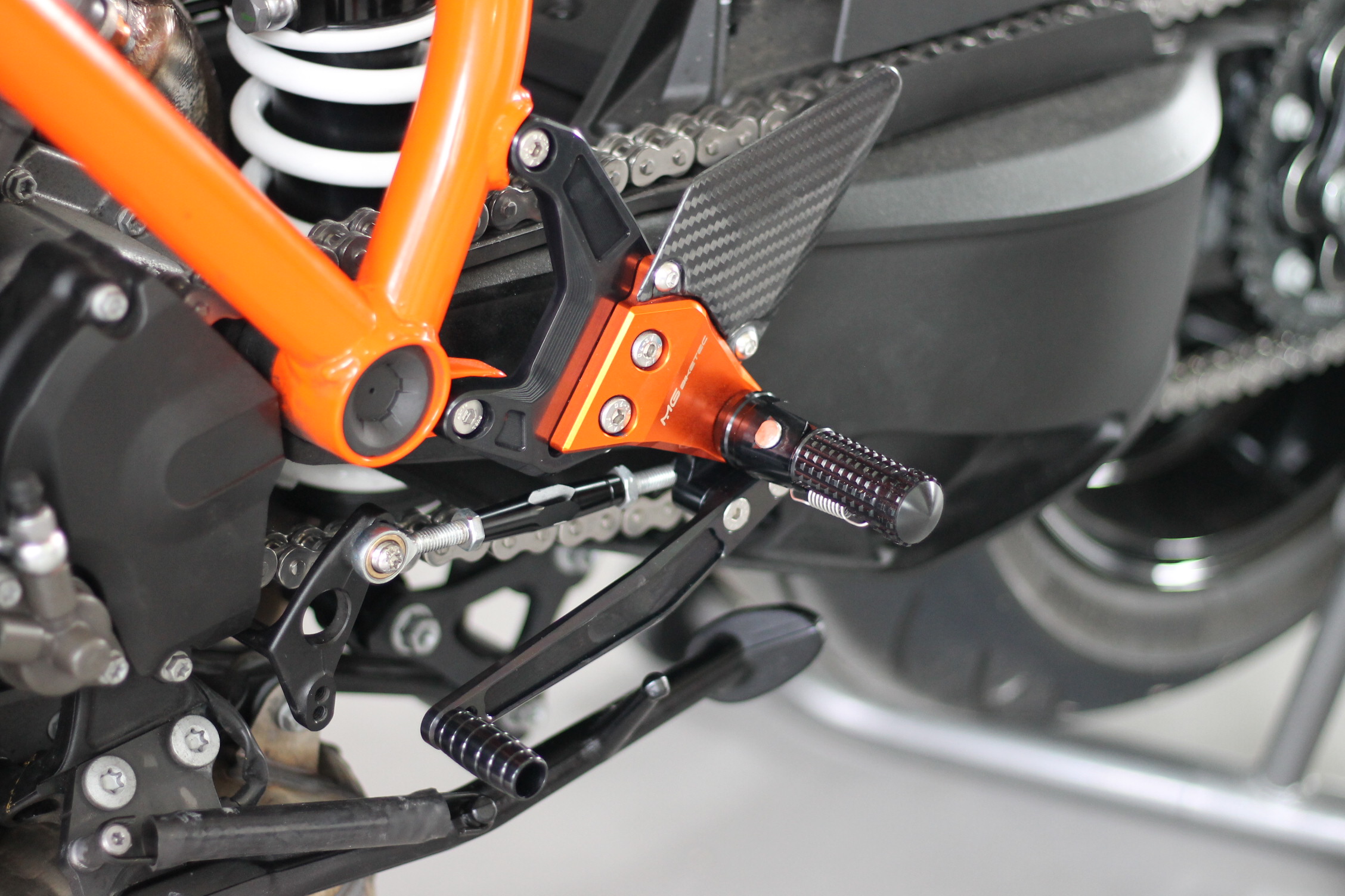 Sistema de reposapiés racing, completamente ajustable ergonómicamente en 18 posiciones y hasta 45 mm.