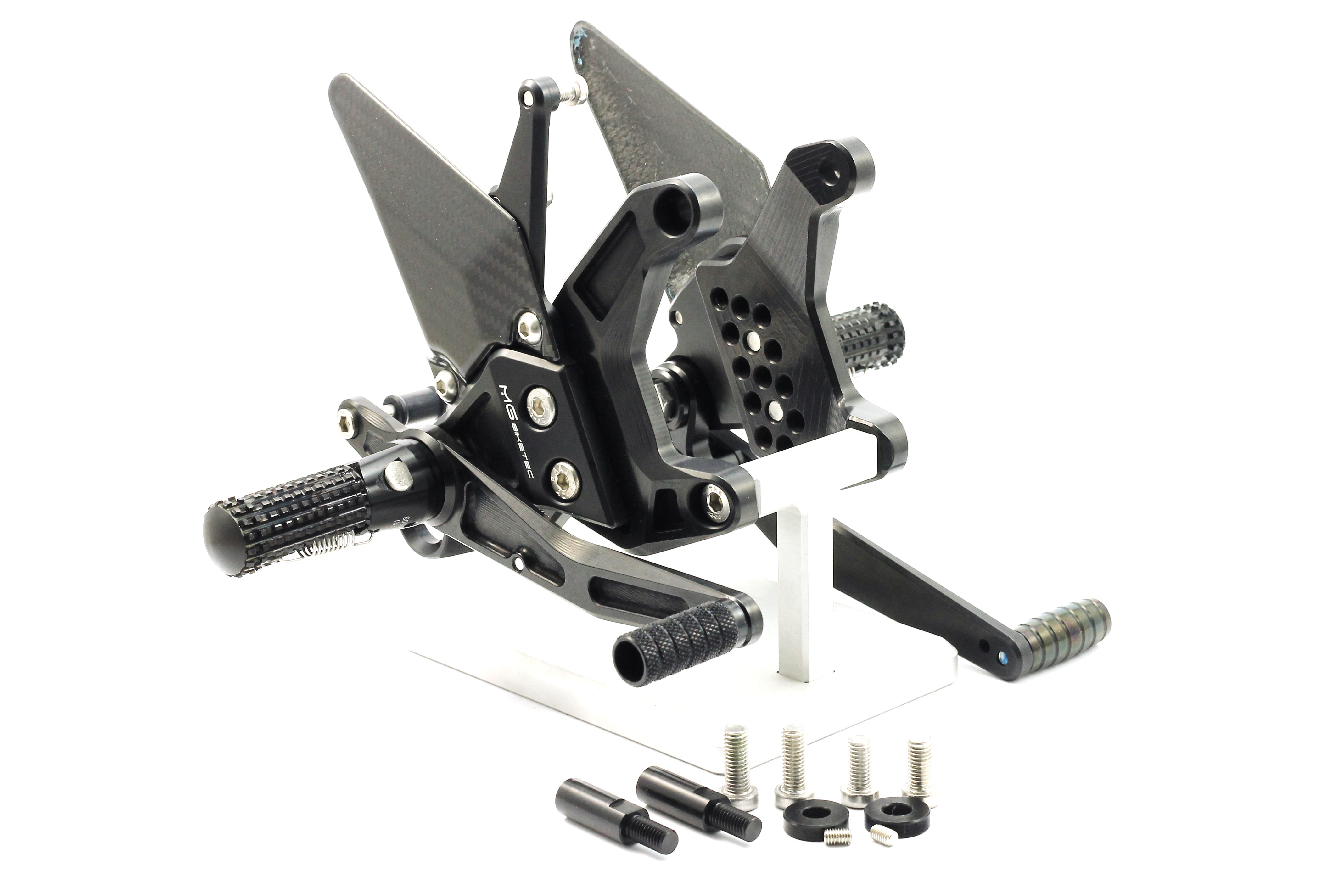 • Pedane pieghevoli, incluse 2 viti senza fine da convertire in pedane rigide per l'utilizzo in gara